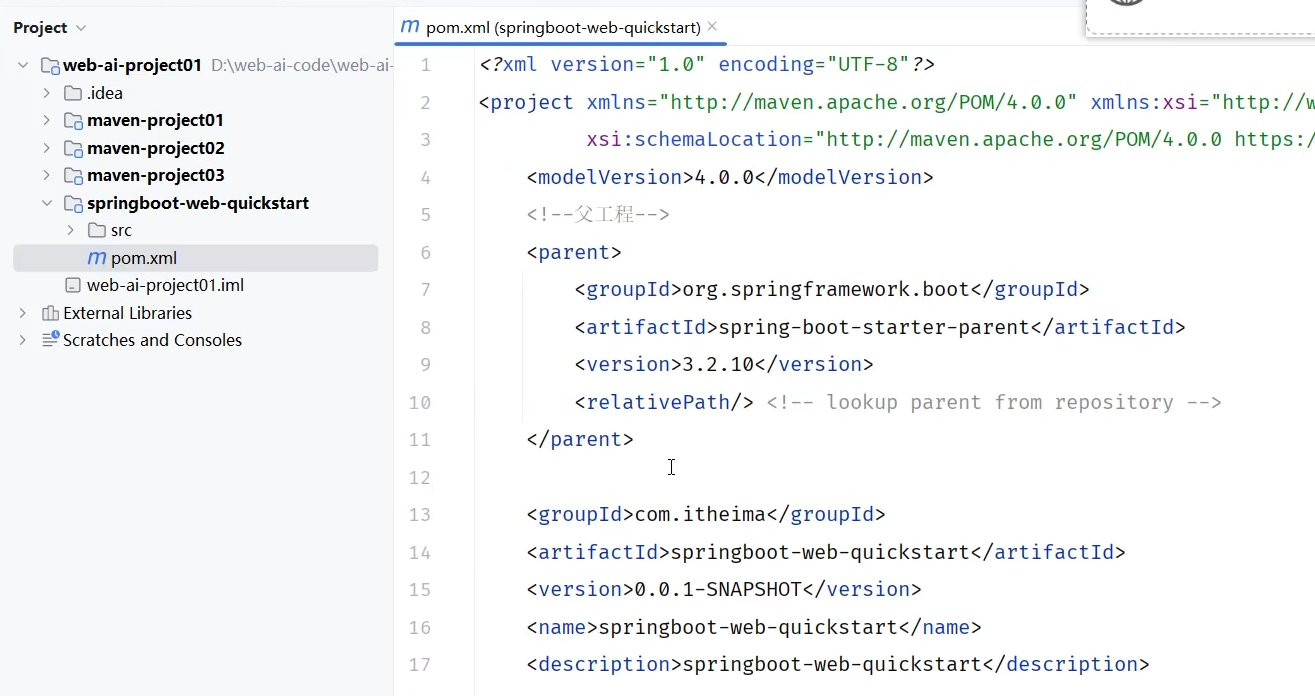 父工程,version是springboot的版本,下面是该模块的坐标。这个pom.xml不用改动。