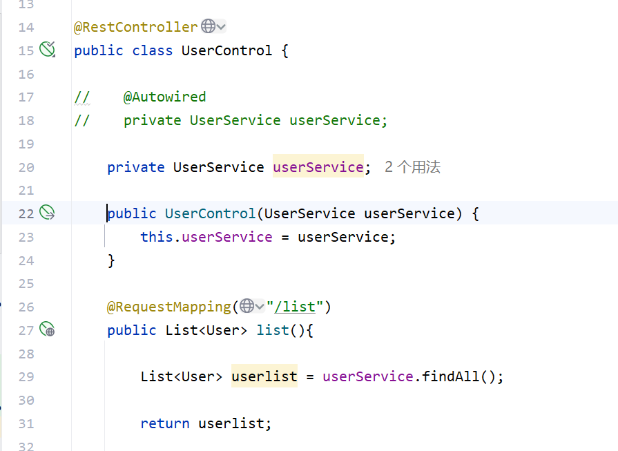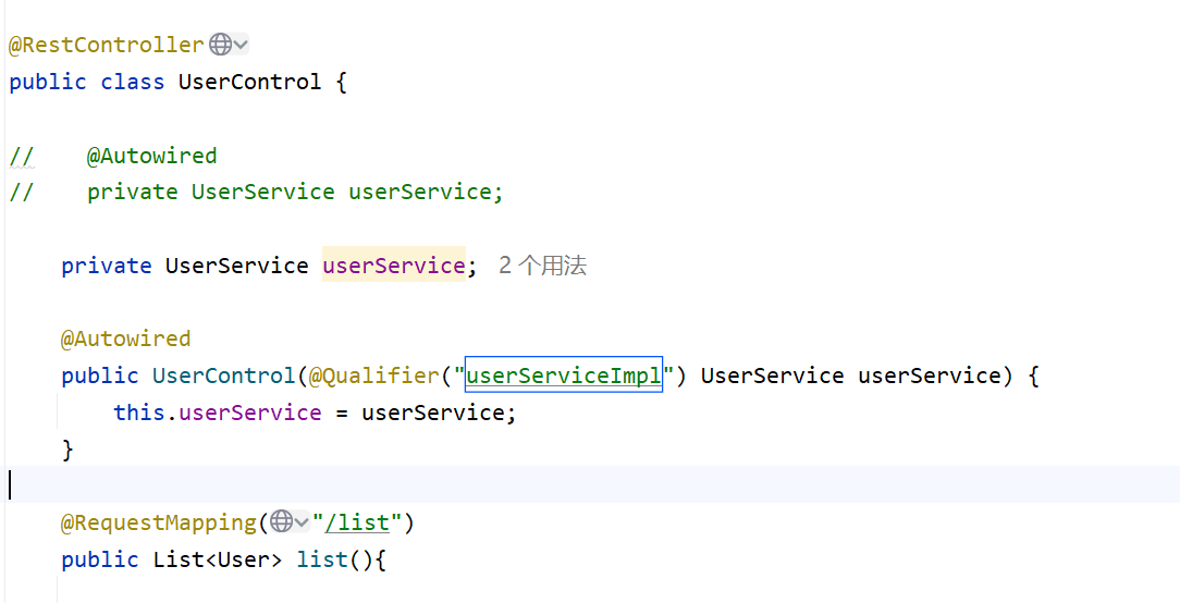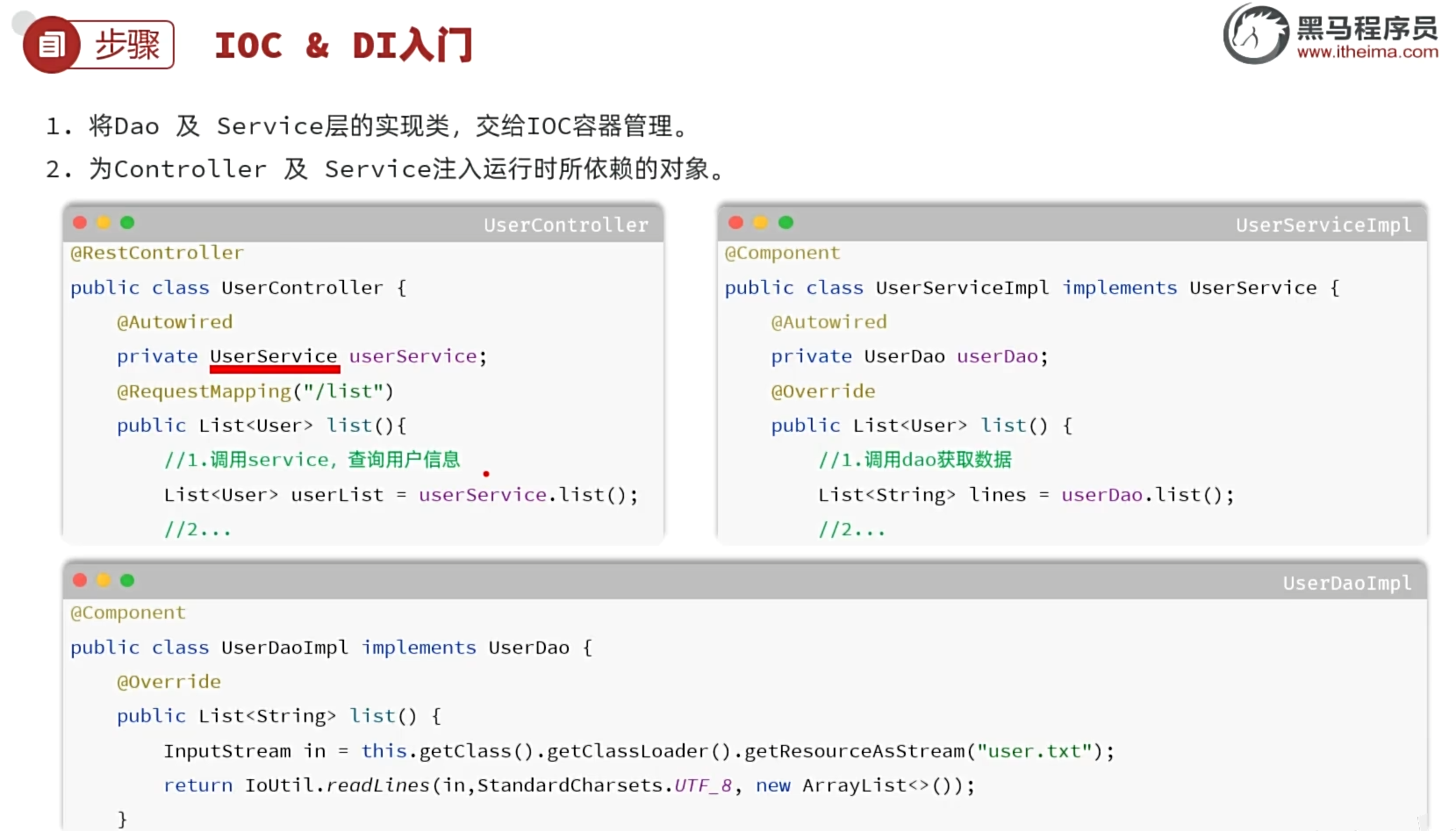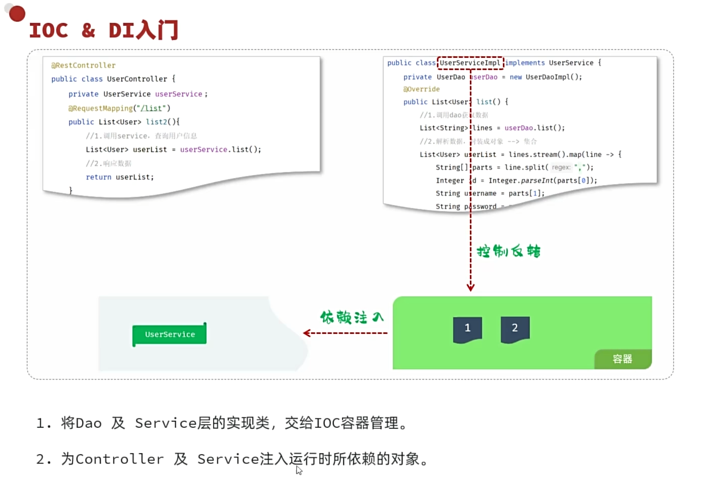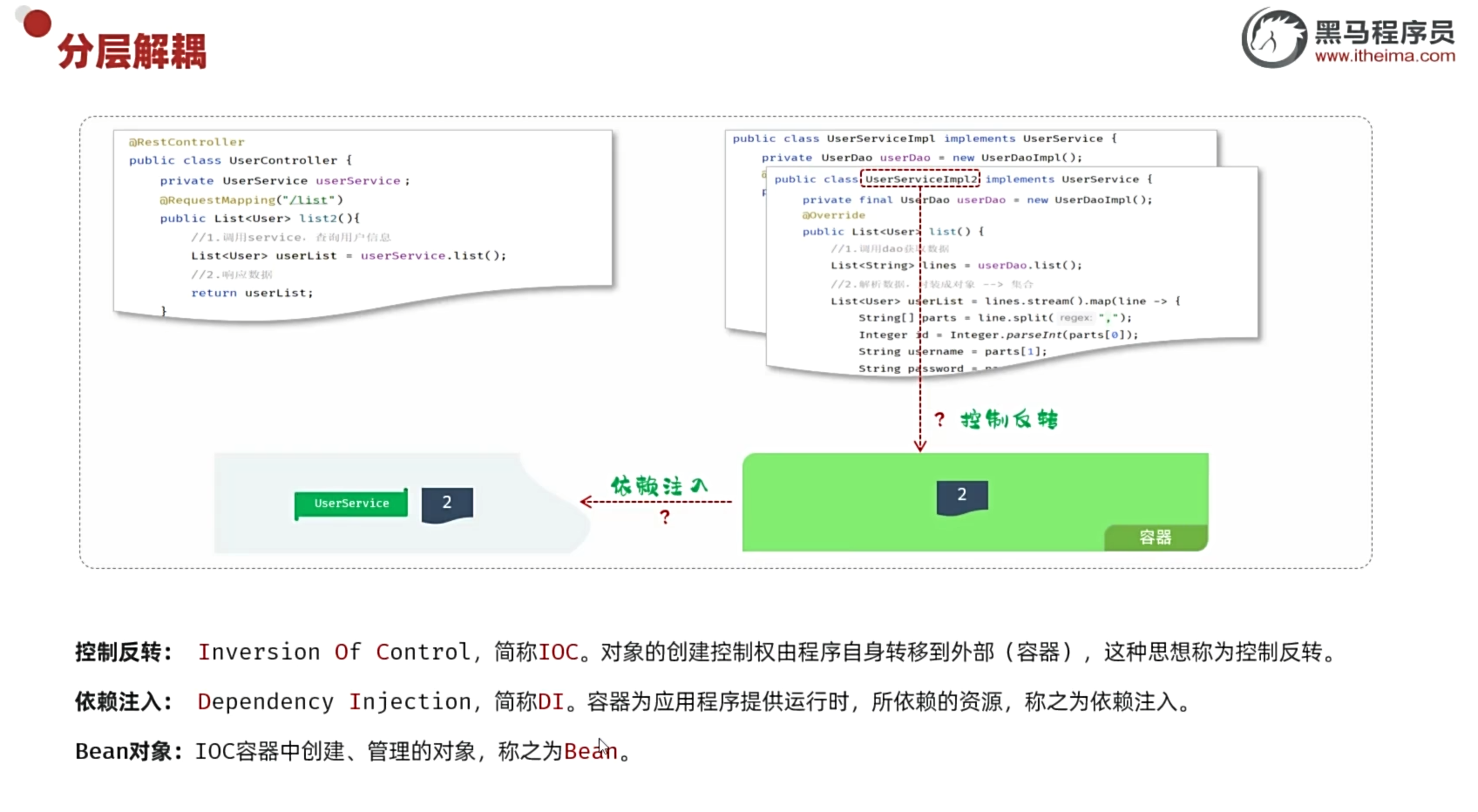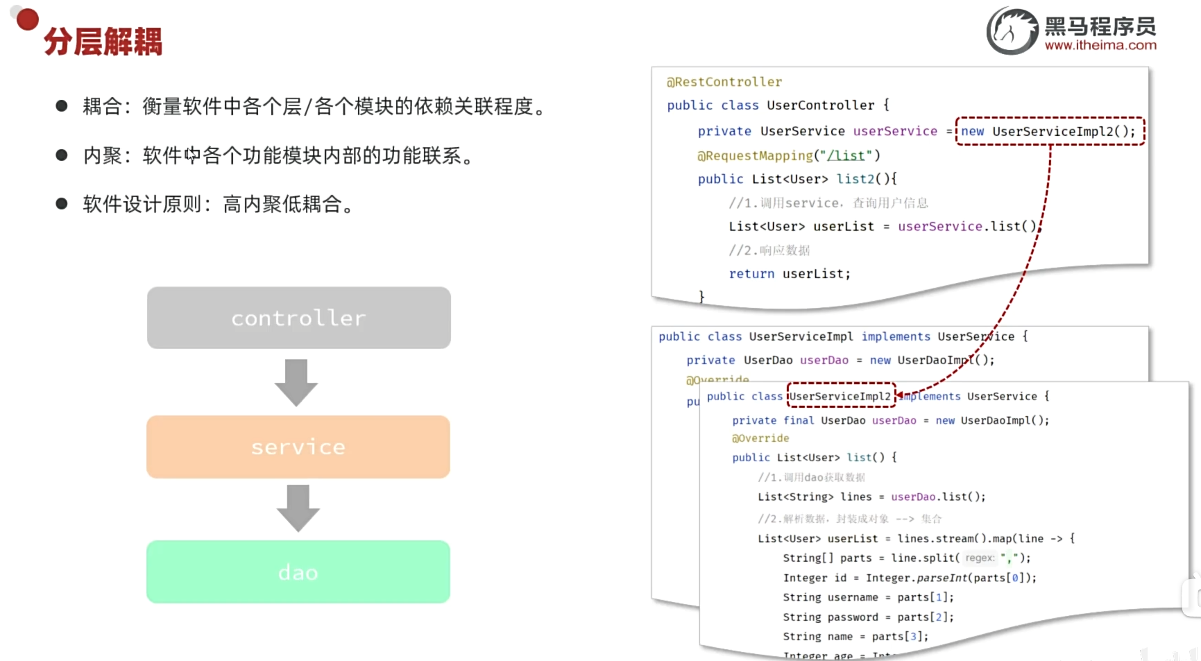 controller和service之间通过创建对象,调用对象的方法来关联(耦合),为了以后在更新类service时,改动代码不那么复杂,就开始了解耦。