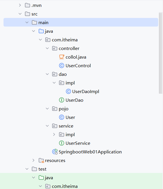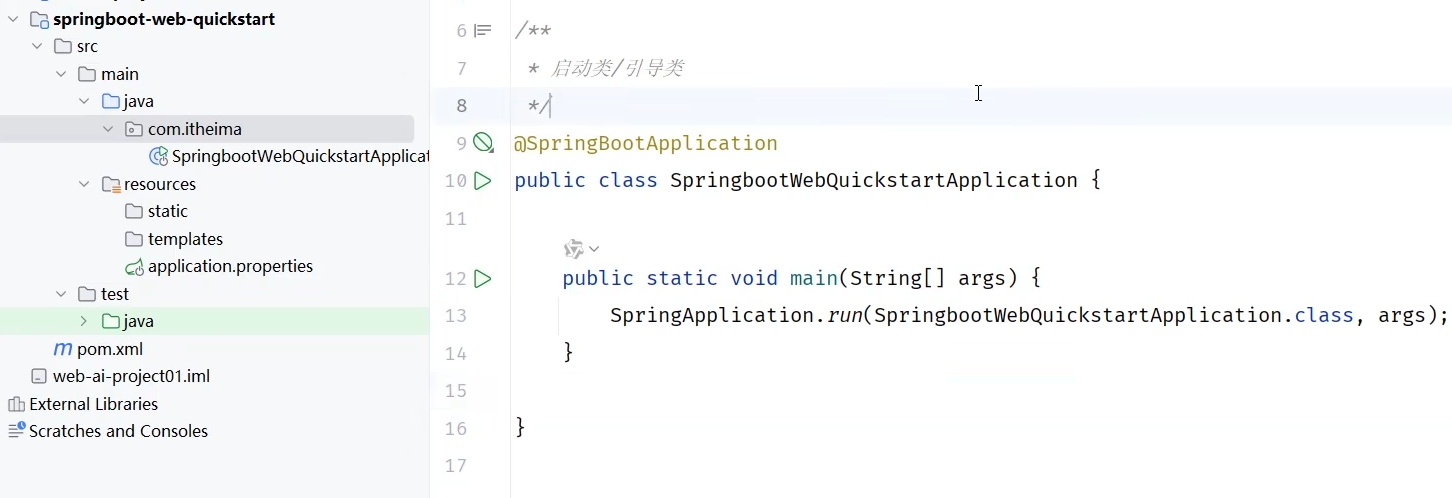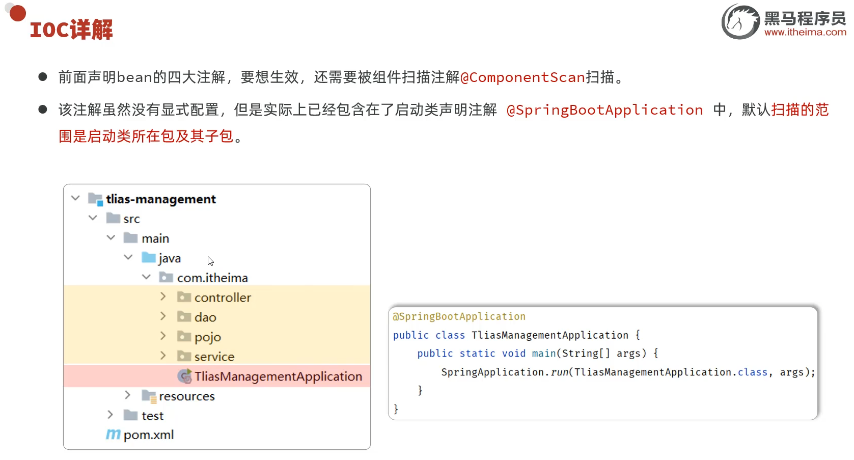 所以在写web应用时,一定要注意模块代码的结构:启动类一定要在com.itheima下面。这样才能扫描IOC的四大注解。这些IOC的注解(把类的对象都放到容器中)才能生效。