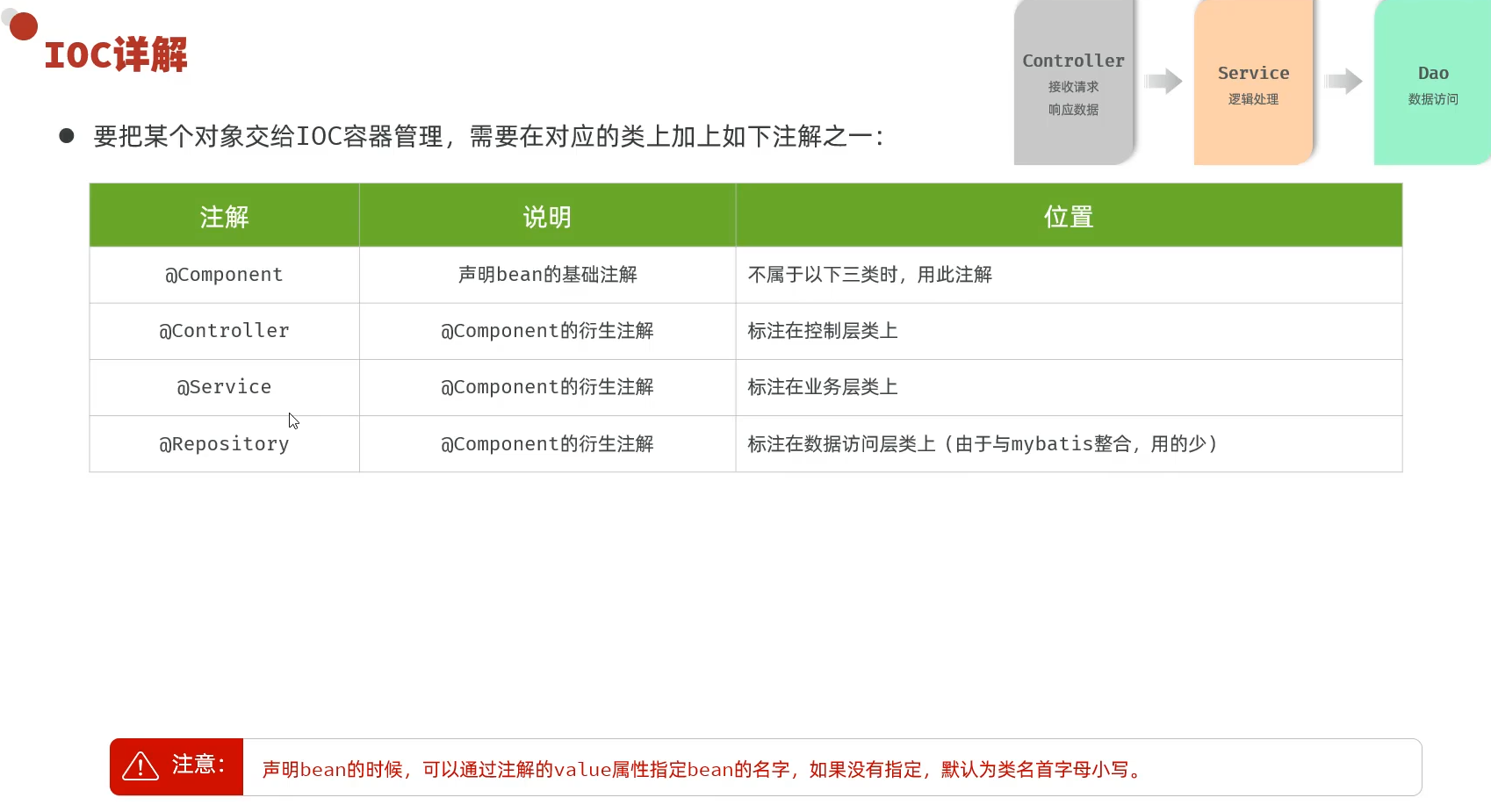 - 控制层、业务层和数据访问层的IOC注解都不一样,要规范使用。