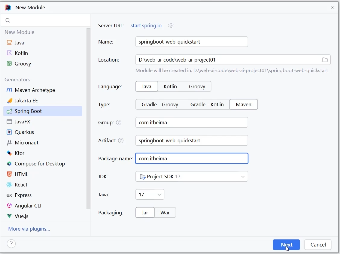 之后next---------选版本都可以,就是不选快照版本------------依赖项选择web spring。