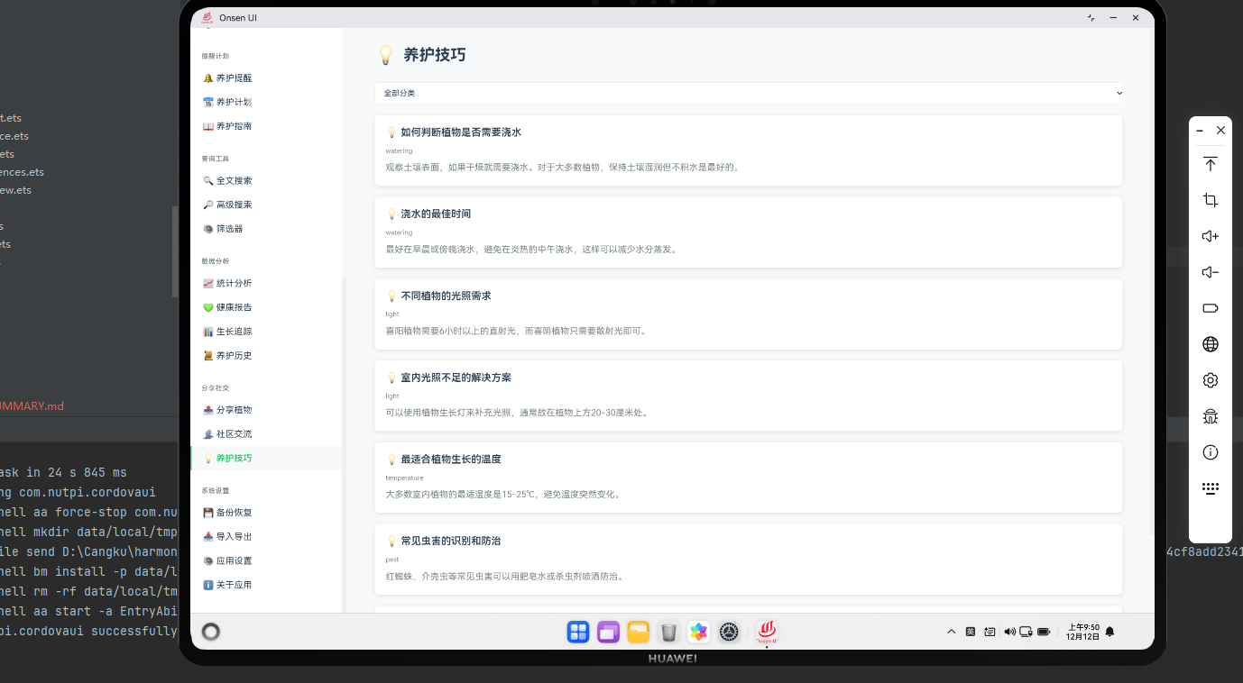 养护技巧系统为用户提供了专业的植物养护建议和技巧。在Cordova框架与OpenHarmony系统的结合下,我们需要实现一个完整的技巧库系统,包括技巧内容管理、搜索和推荐功能。