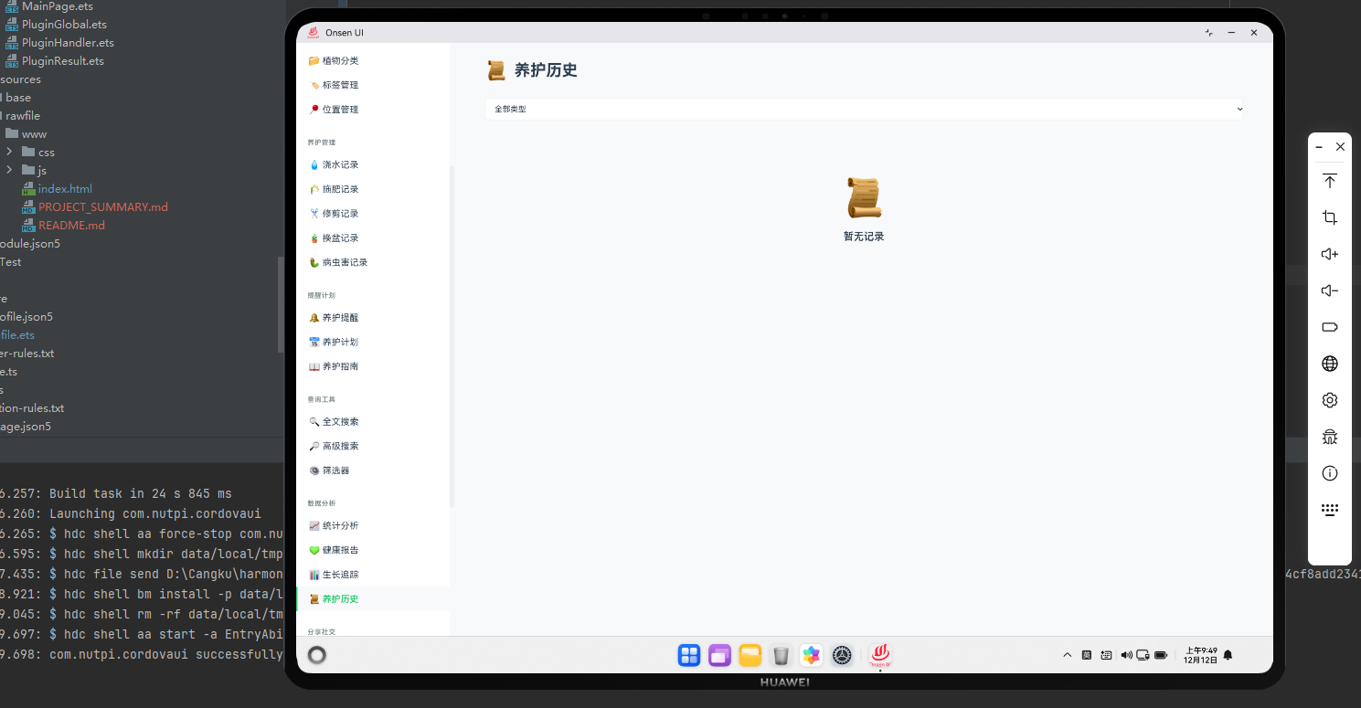 养护历史系统记录和管理植物的所有养护活动。在Cordova框架与OpenHarmony系统的结合下,我们需要实现一个完整的历史记录系统,包括记录查询、统计和导出功能。