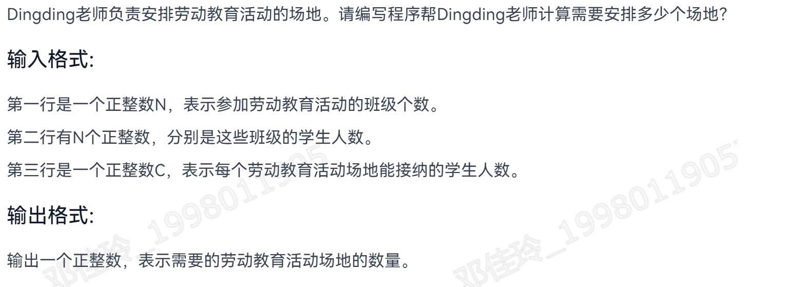 - 计算所需场地数量:如果总人数sum能被C整除,则场地数为sum/C,若不能整除,则场地数为sum/C+1(需额外一个场地容纳剩余学生);