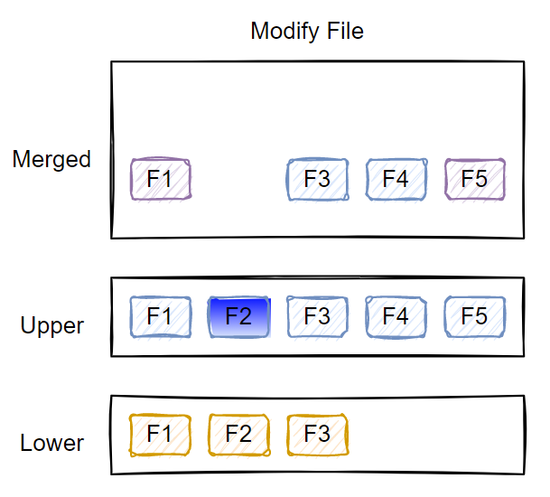 OverlayFS 会读取上下两层的内容。如果一个文件存在于两个层级(F3),则上层的文件优先于下层的文件。对文件或目录的每个操作都会产生特定的结果。