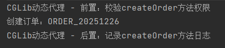 proxy.createOrder("ORDER_20251226");:调用代理对象方法,触发intercept方法,执行增强逻辑和目标方法调用。