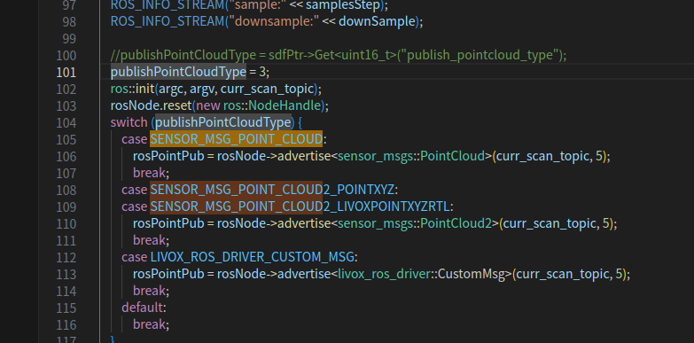 #将101行改为自己需要的点云格式:0->PointCloud;1/2->PointCloud2;3->CustomMsg