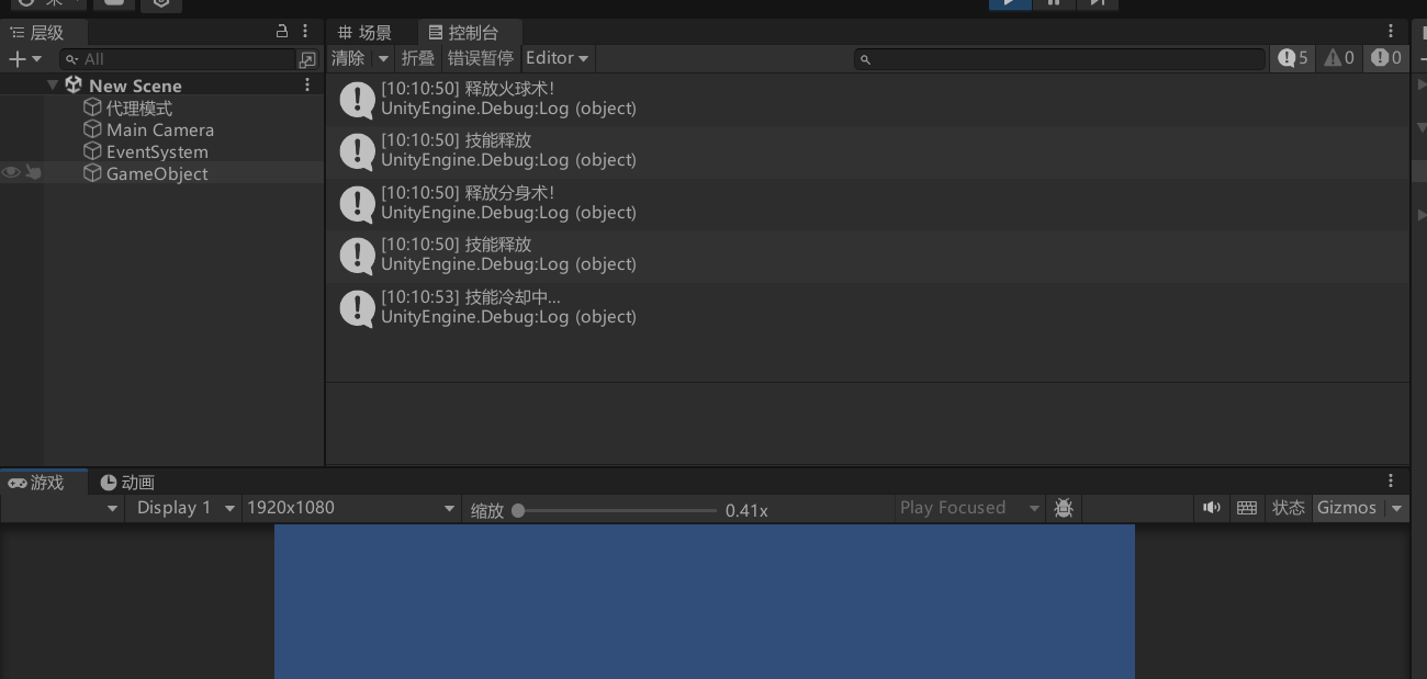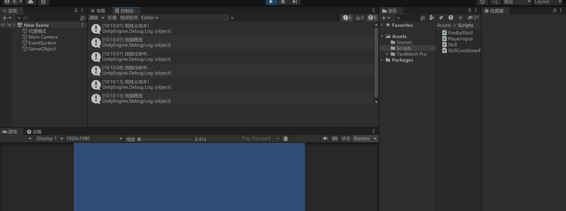 将PlayerInput加到场景中的一个空对象上,然后运行游戏按下Q键,发现成功打印了火球释放,连续按下会提示技能正在冷却。