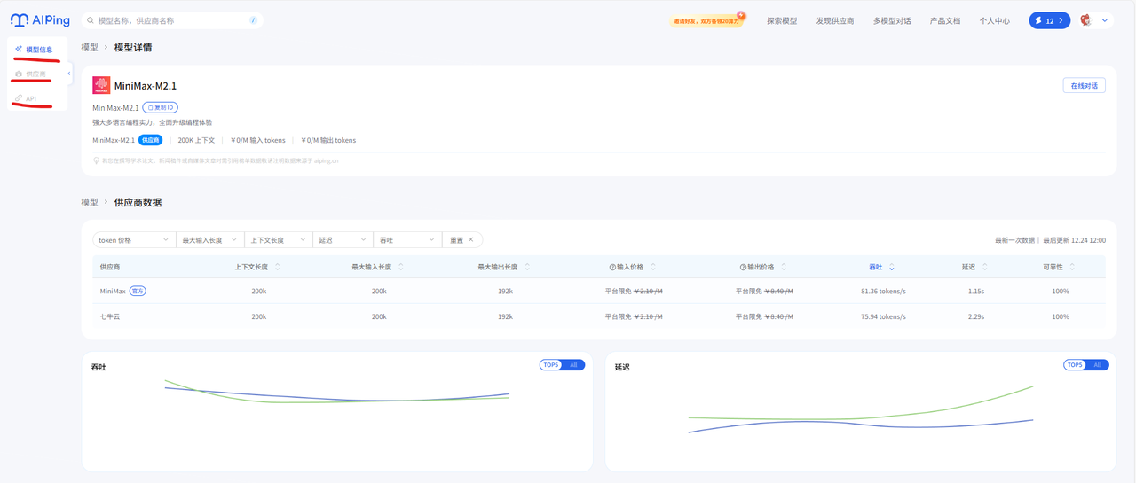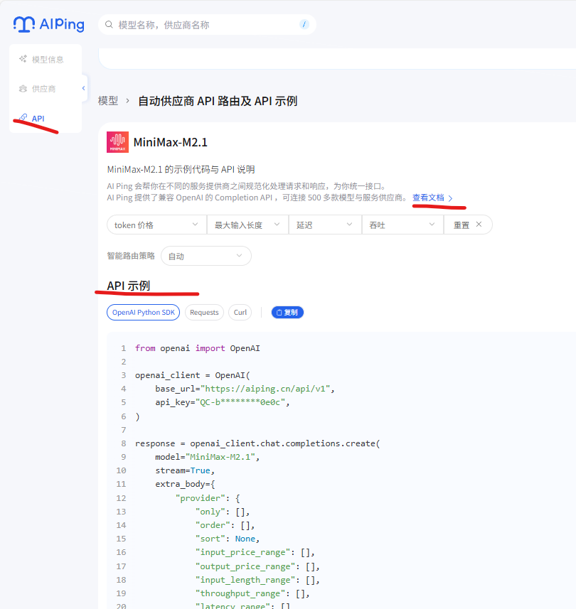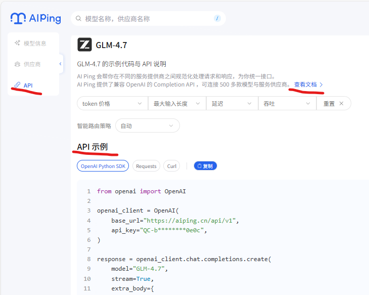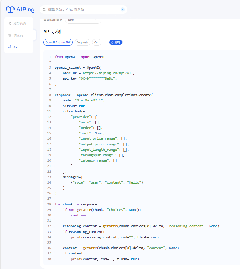 可以看到AI Ping提供了一些供应商数据和可调用的API(Application Programming Interface应用程序编程接口)