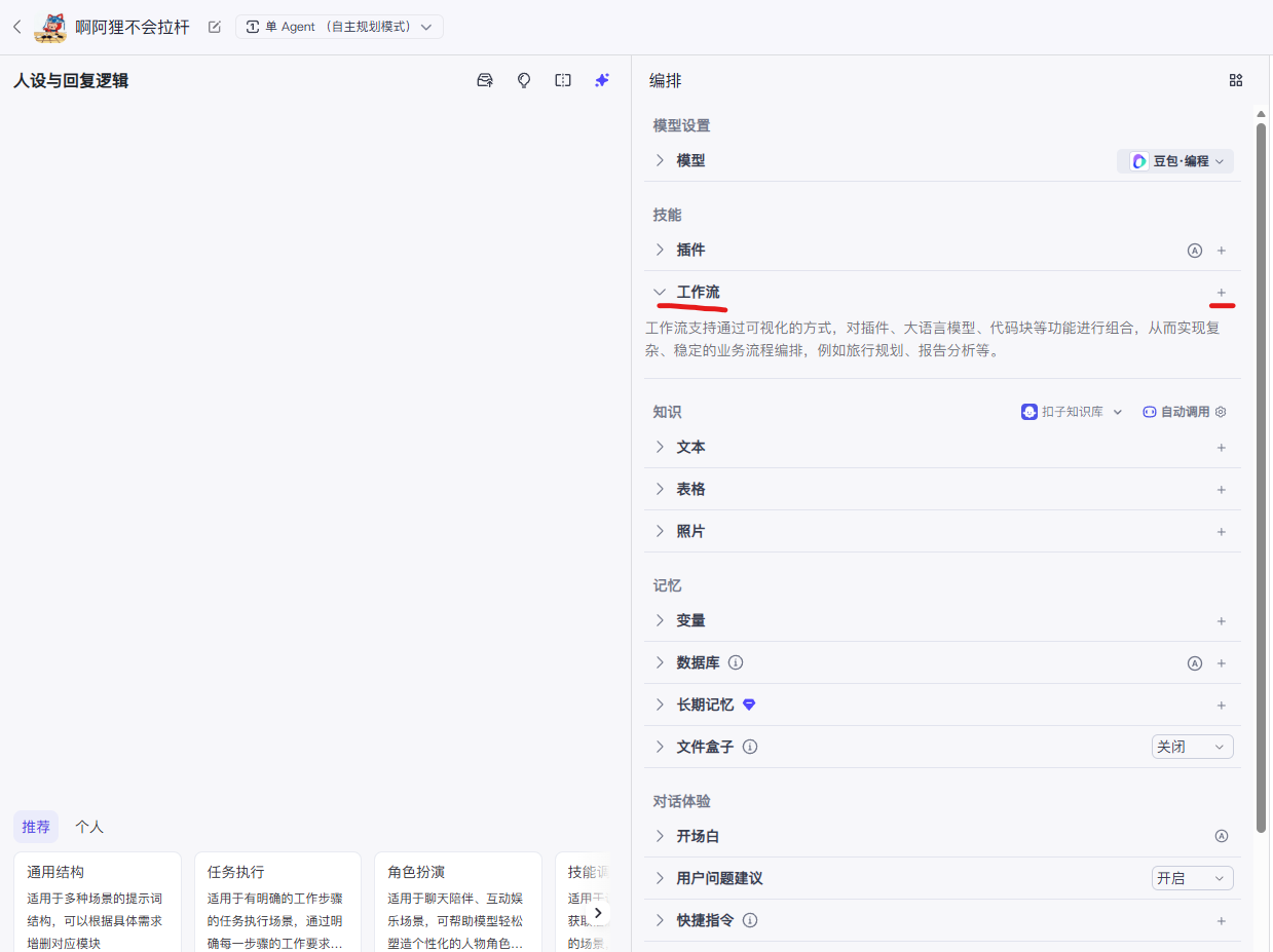 2.进入智能体编辑页面,点击「工作流」标签页,选择「+ 添加新工作流」→「从空白创建」。
