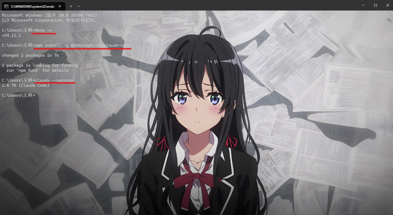 安装完成Node.js可以通过命令行Node -v验证是否安装成功并查看版本信息,然后npm install -g @anthropic-ai/claude-code安装Claude Code安装完成通过claude --version验证安装成功与否
