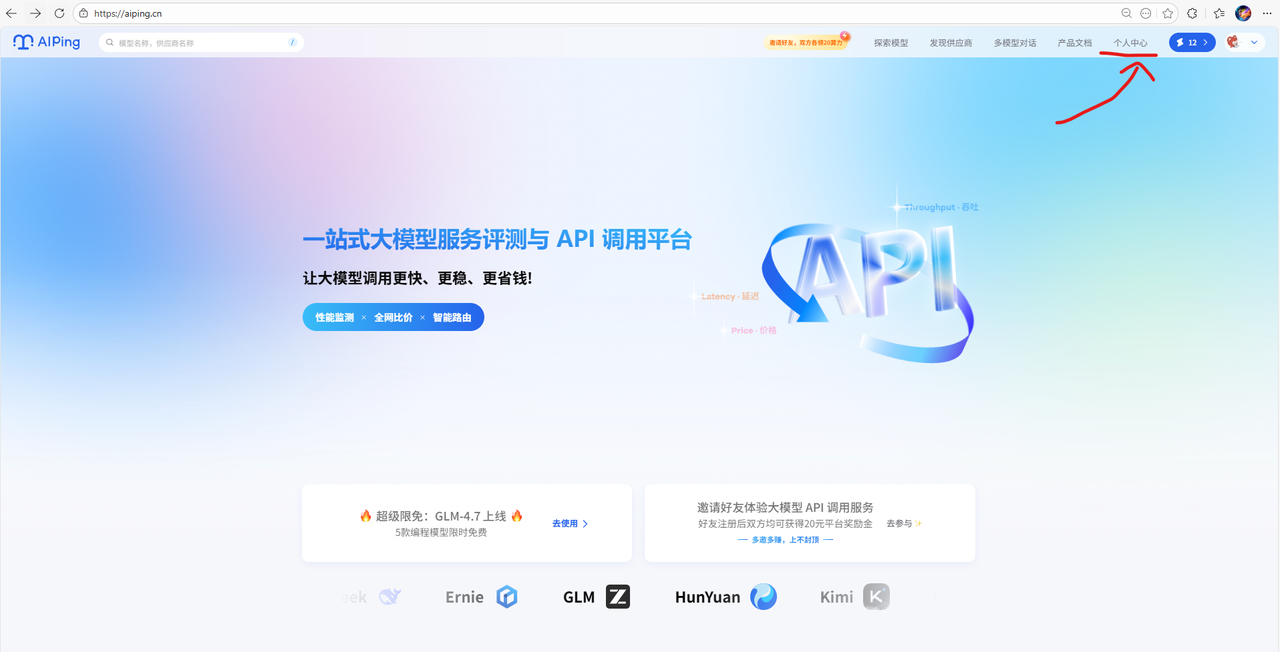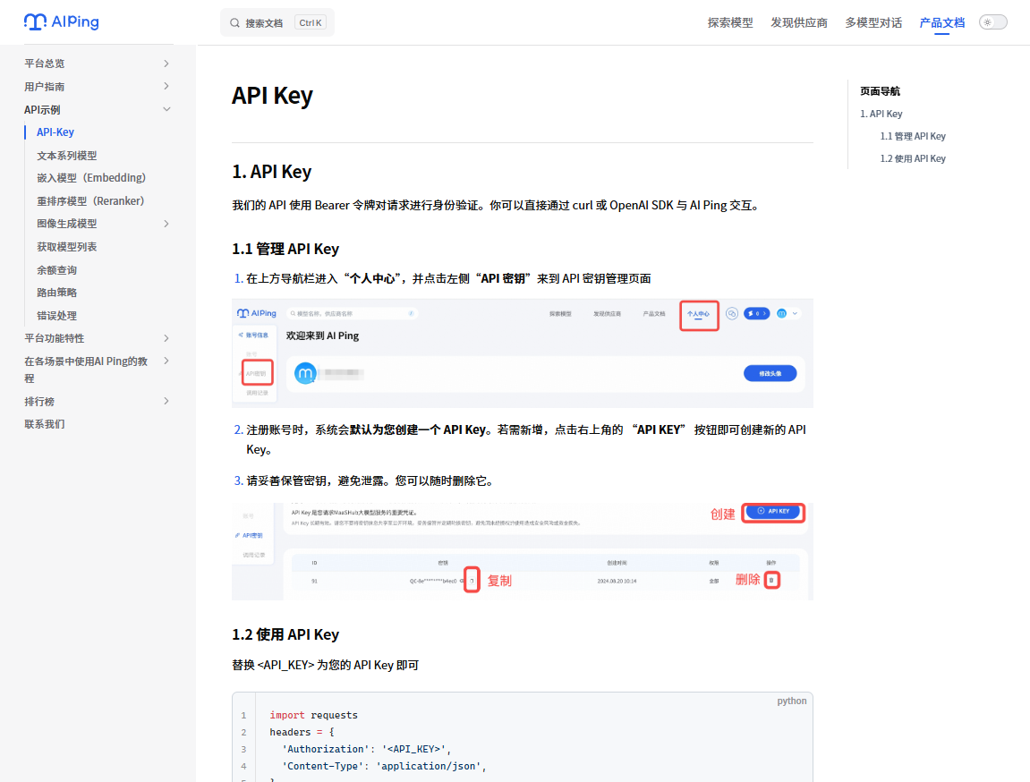 这个就是前面讲过的API Key,在AI Ping官网首页右上角的"个人中心"可以找到并创建