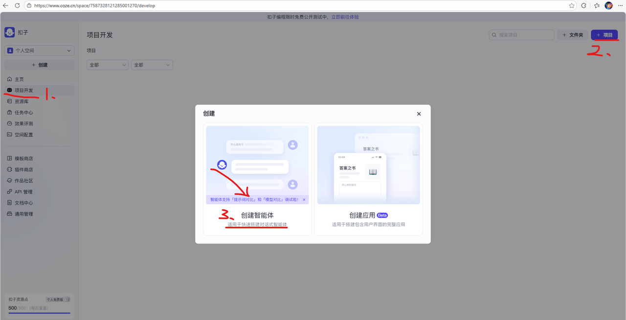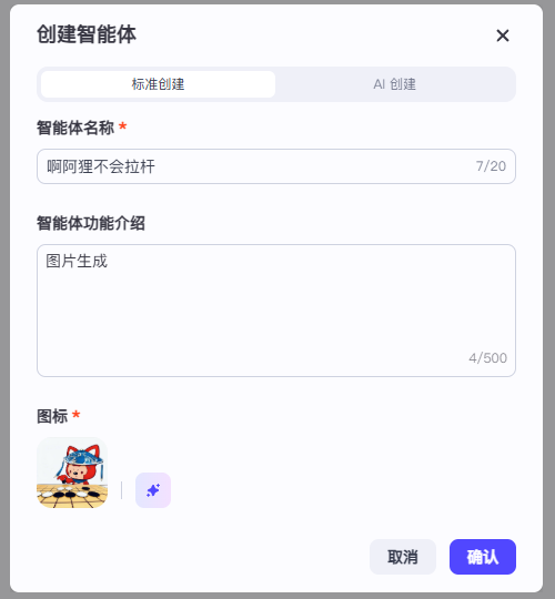 返回 Coze 首页,点击「创建智能体」,填写智能体名称(如「MiniMax 后端开发助手」)与描述;