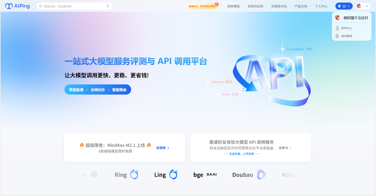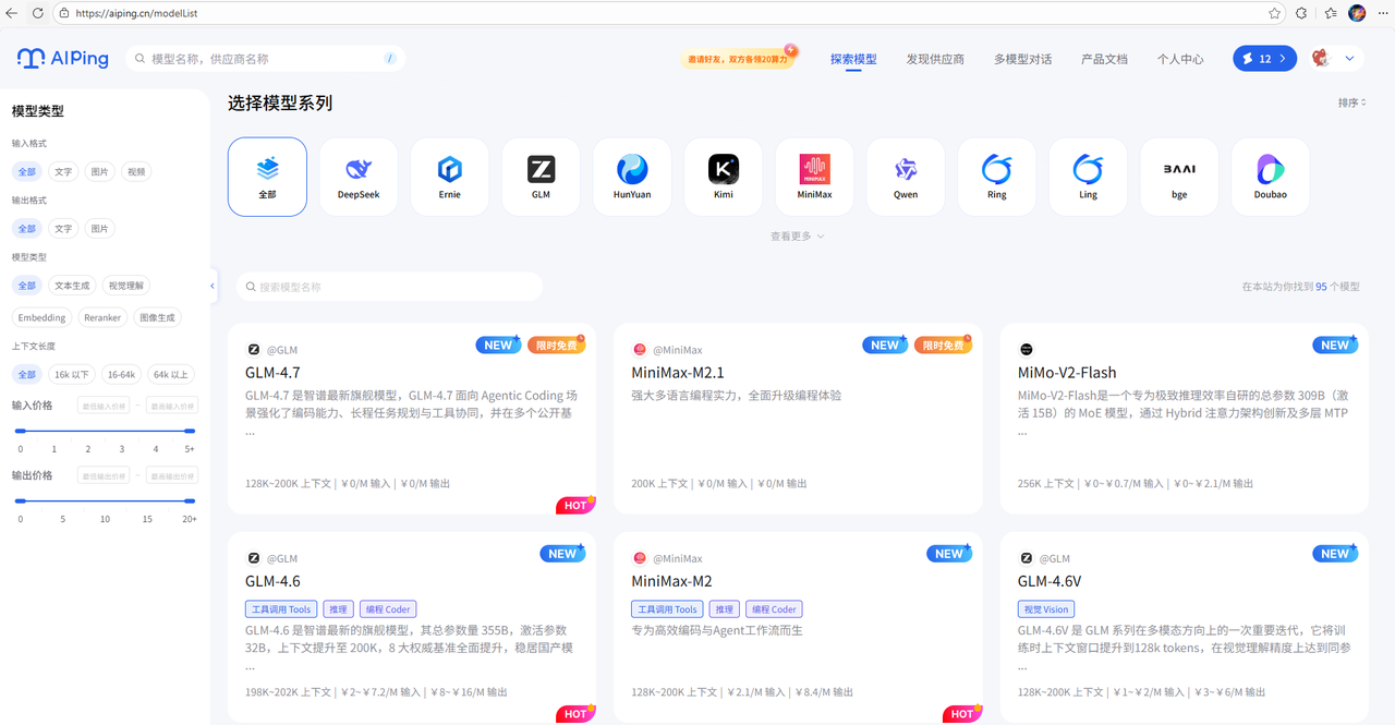 在国产大模型快速迭代的当下,AI Ping 平台作为国内领先的大模型服务评测与聚合平台,聚合了智谱、MiniMax 等主流厂商的 95+ 款模型,涵盖文本生成、视觉理解等多种类型,为开发者提供了统一调用入口与客观性能数据参考。其中,最新上线的 GLM-4.7 与 MiniMax M2.1 两款旗舰模型,分别聚焦不同工程场景需求,且支持免费体验与 OpenAI 兼容接口调用,成为开发者处理复杂任务的得力工具。本文将详细介绍两款模型的核心特性、使用配置流程及实践建议。