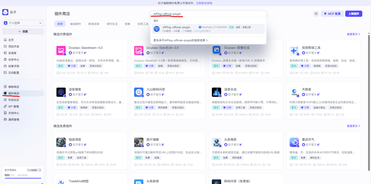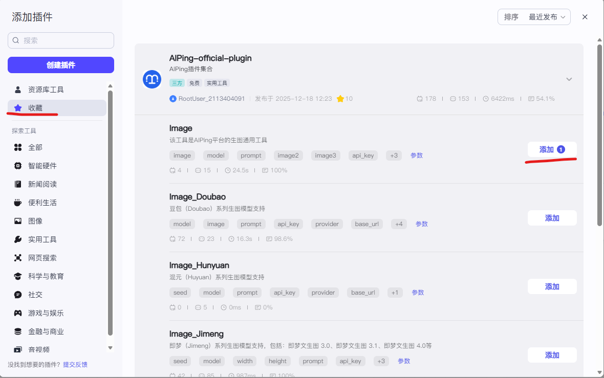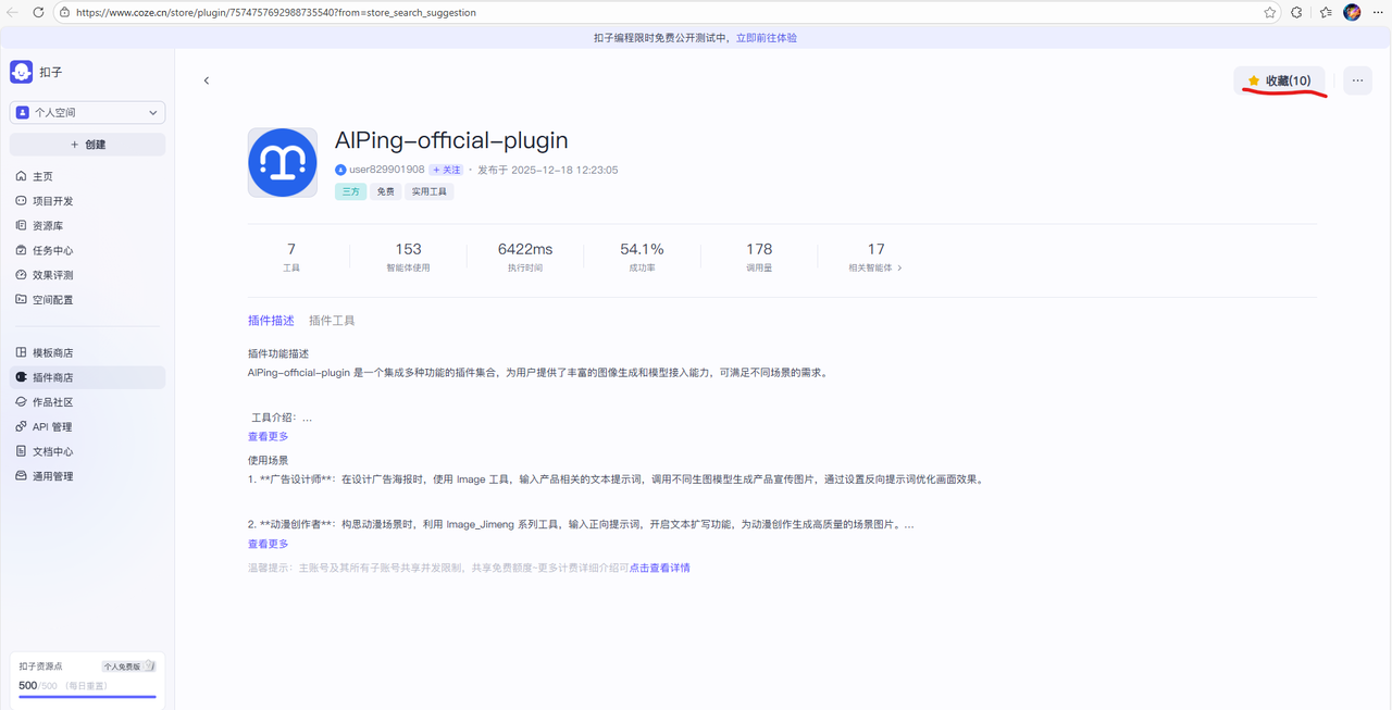 2.搜索「AIPing-official-plugin」,进入插件详情页后点击「收藏」,方便后续调用。