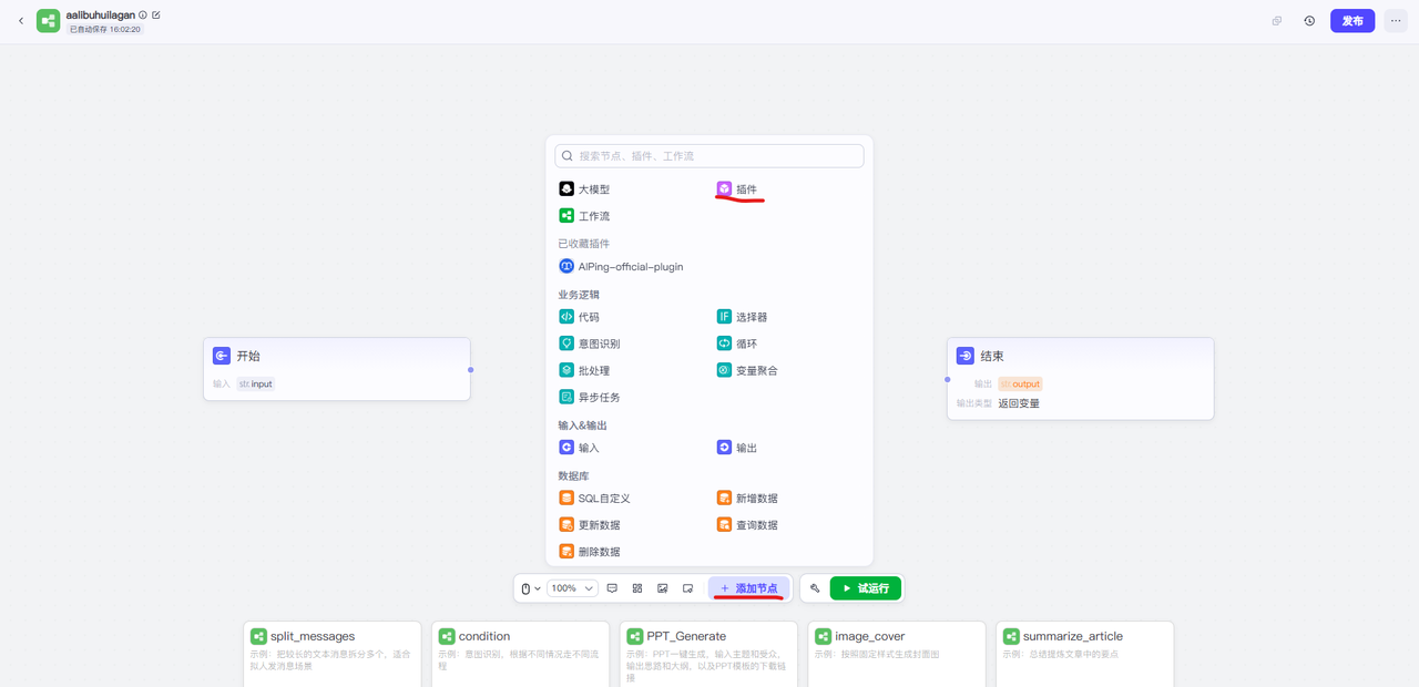2.在工作流编辑器中,点击「+ 添加节点」,选择「插件」→「我的收藏」,找到「AIPing-official-plugin」并添加;