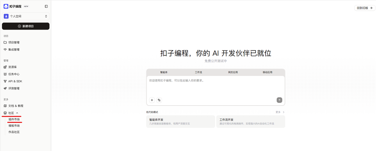 - 登录 Coze 官网,进入左侧「插件市场」,或者首页点击扣子编程进入Coze官网;