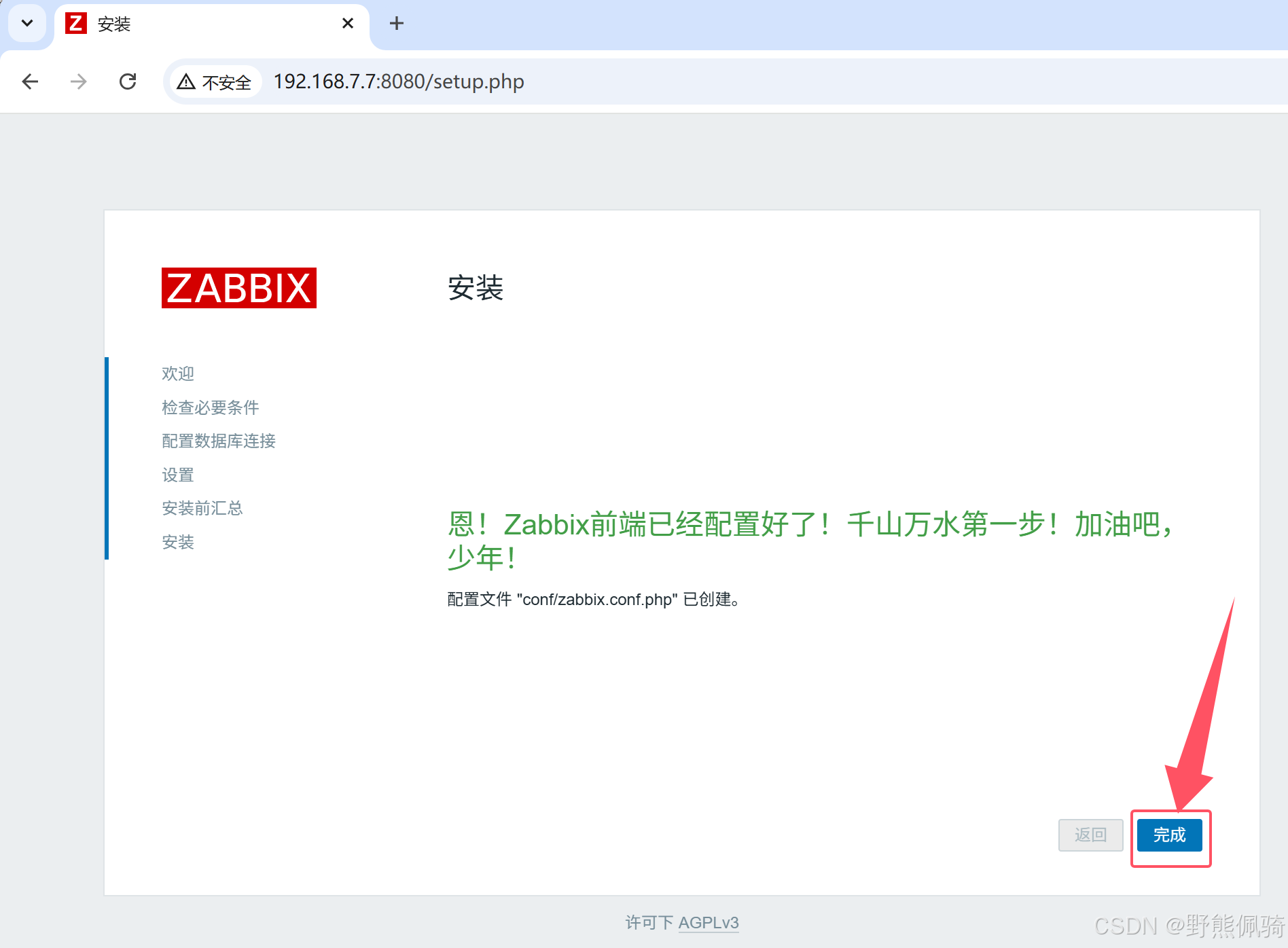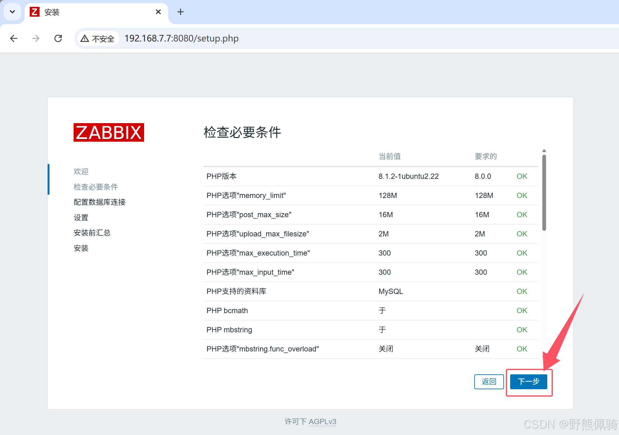 第一次访问Zabbix监控平台时,需要配置数据库等相关信息。