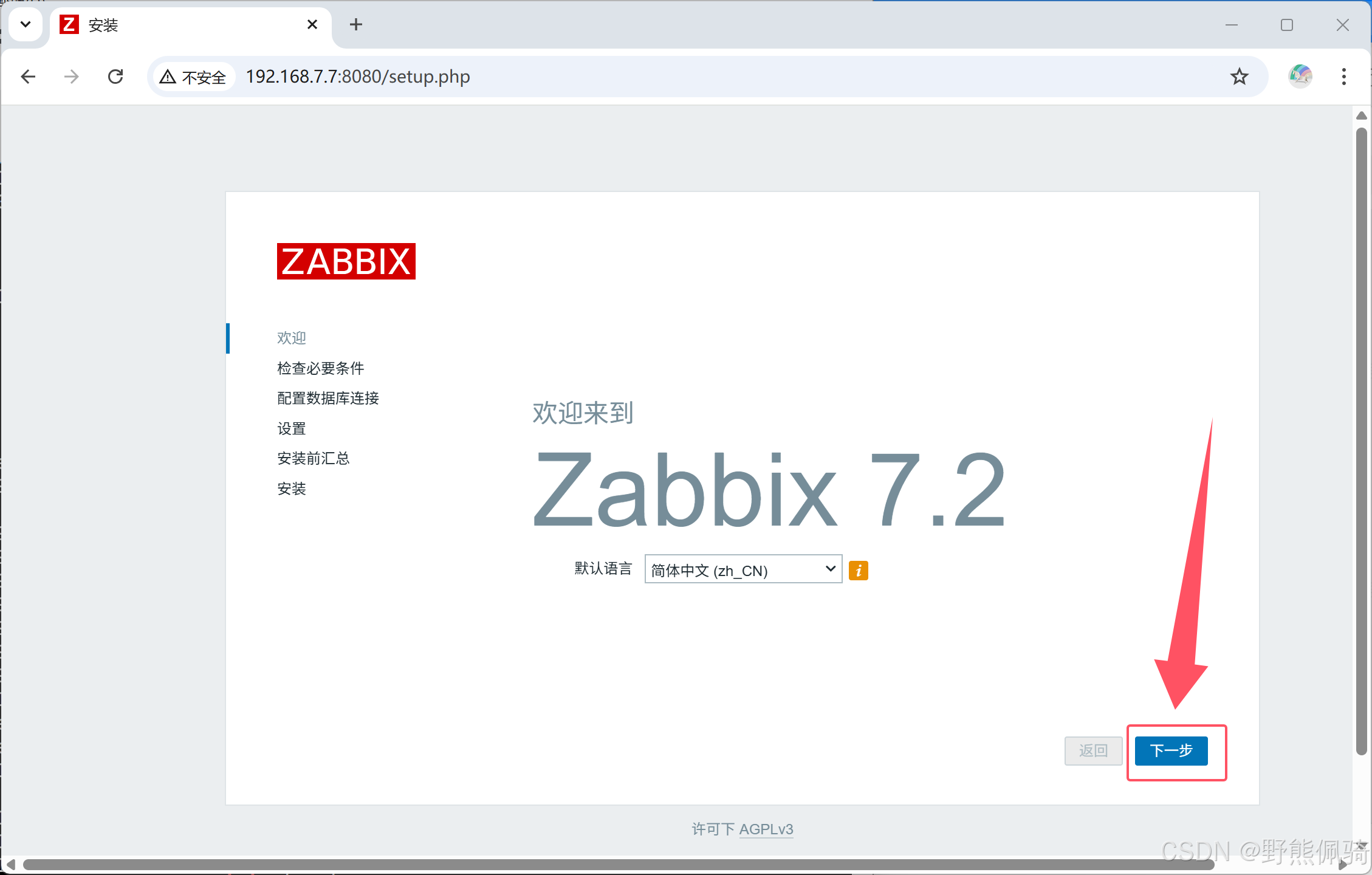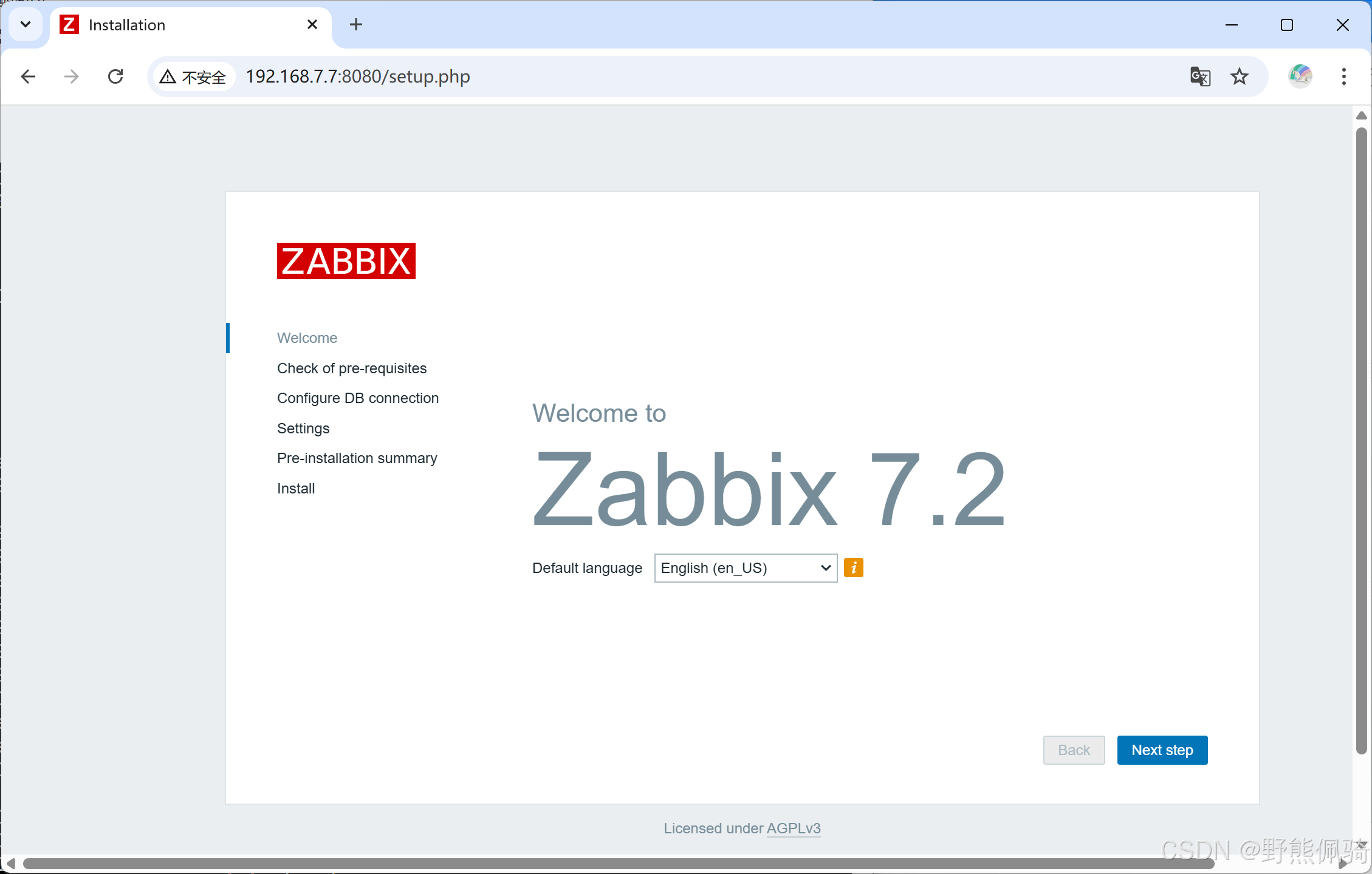 - 使用浏览器打开Zabbix监控平台:http://192.168.7.7:8080/