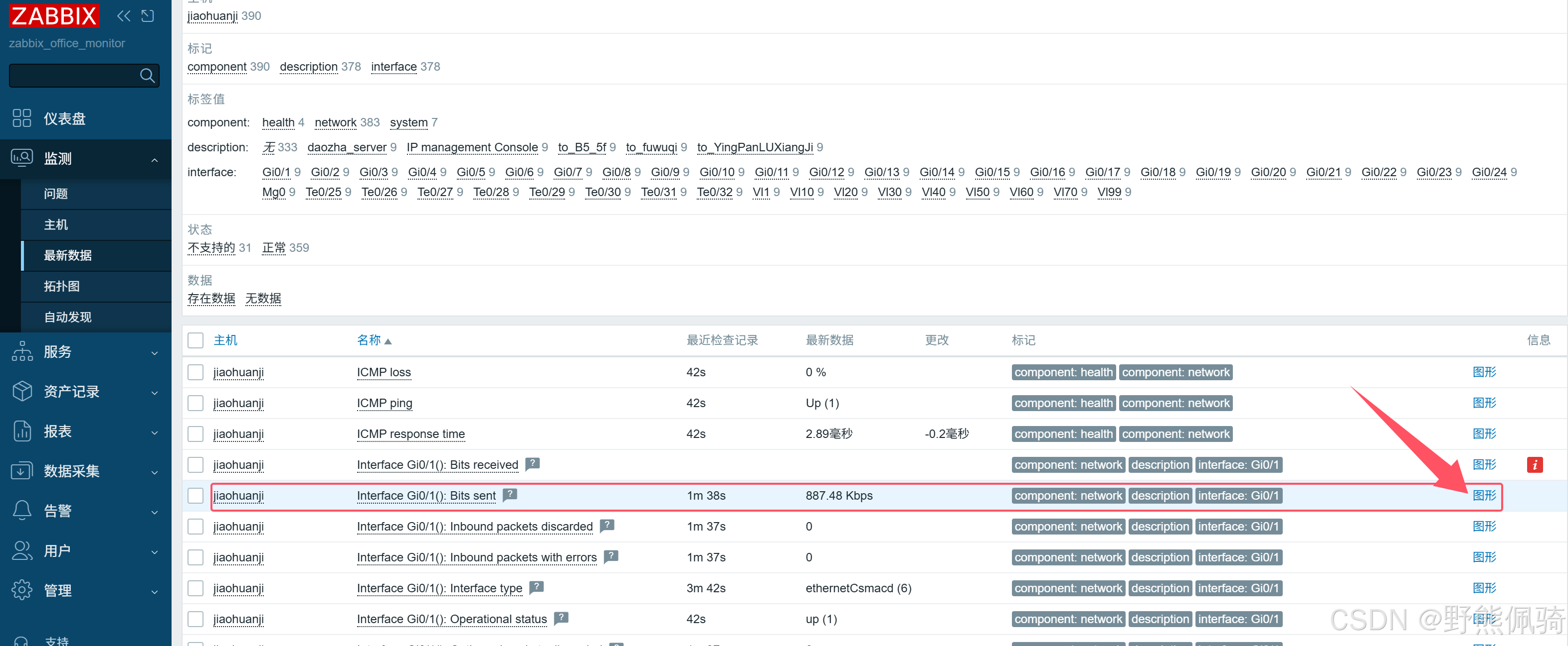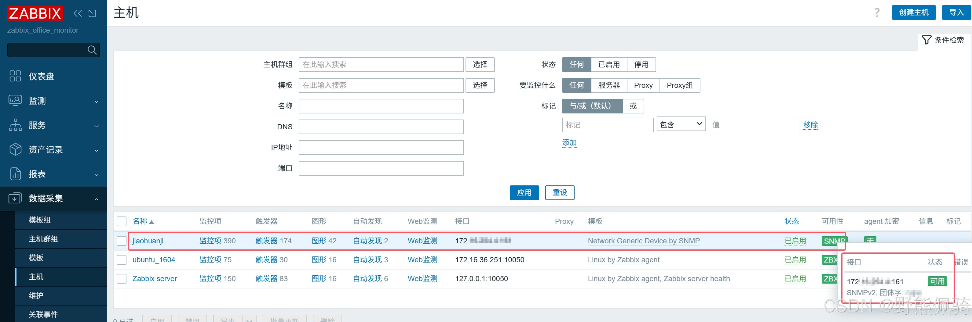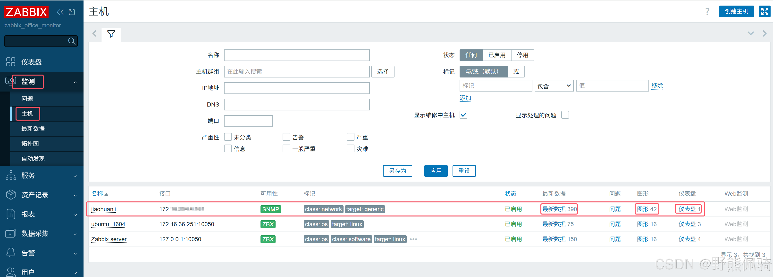 - 选择"监测"-->"主机",点击"最新数据"、"图形"、"仪表盘"等,都可以看到jiaohuanji主机的最新监控数据。