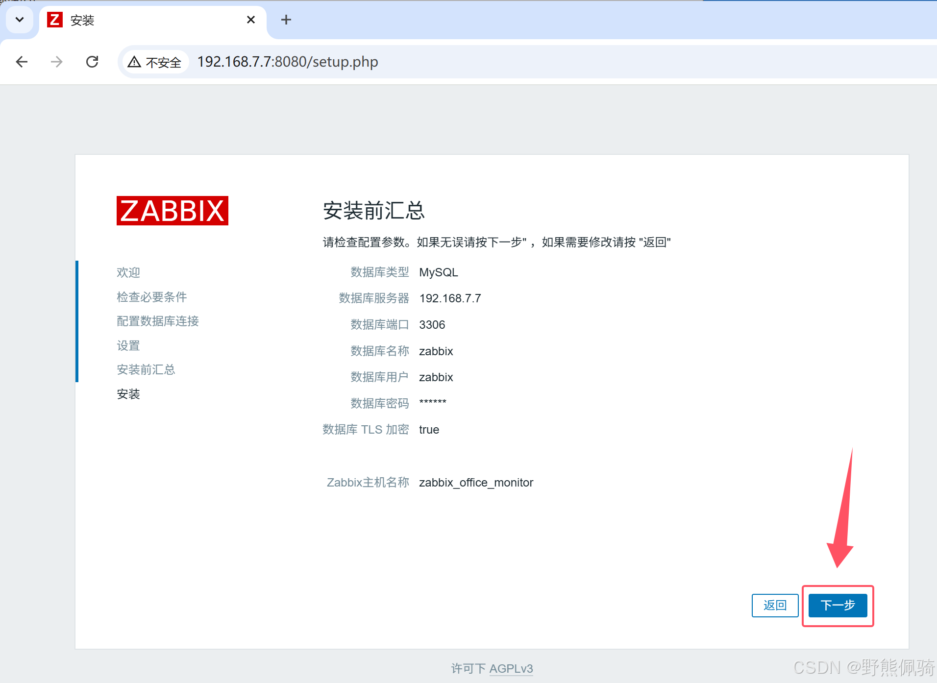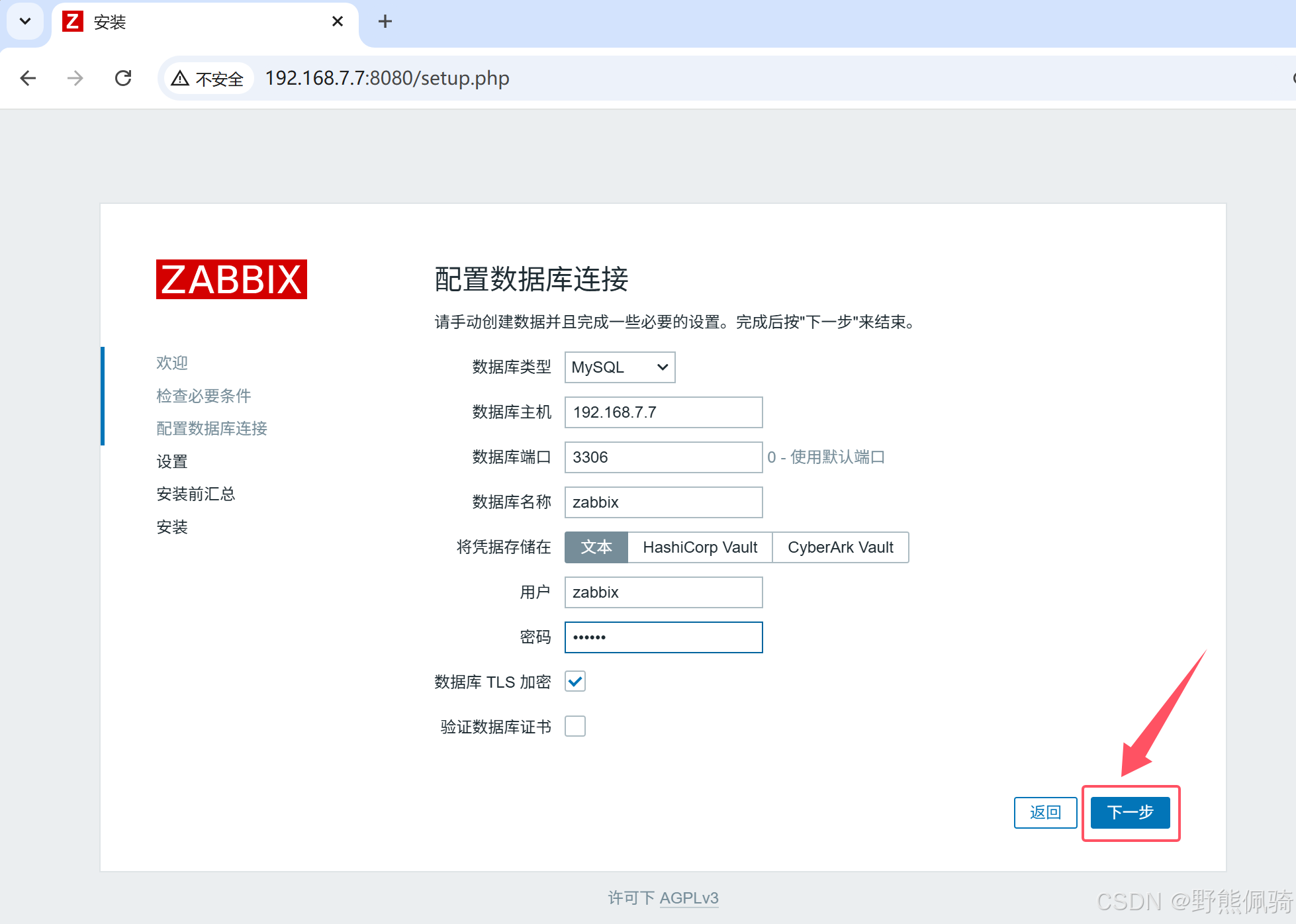 - 根据上面第3步的数据库信息,配置好zabbix数据库相关内容,点击"下一步"