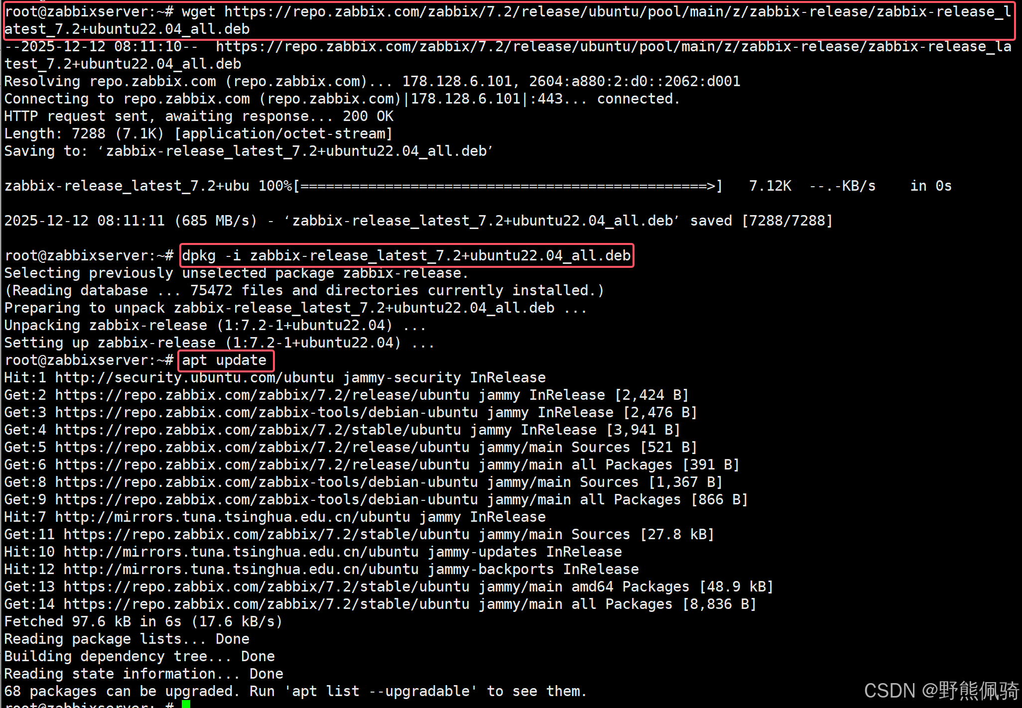 root@zabbixserver:~# wget https://repo.zabbix.com/zabbix/7.2/release/ubuntu/pool/main/z/zabbix-release/zabbix-release_latest_7.2+ubuntu22.04_all.deb root@zabbixserver:~# dpkg -i zabbix-release_latest_7.2+ubuntu22.04_all.deb root@zabbixserver:~# apt update