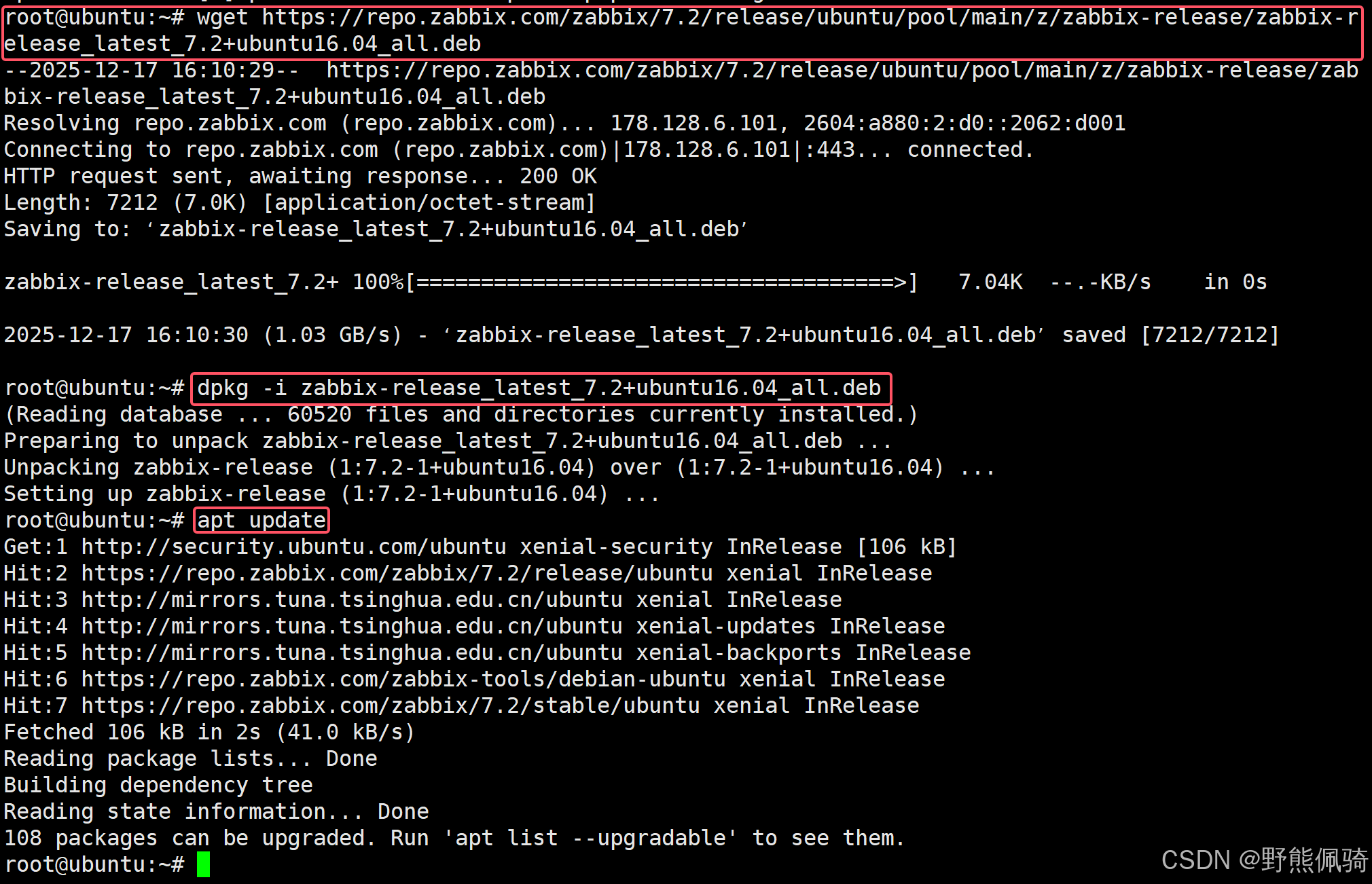 root@ubuntu:~# wget https://repo.zabbix.com/zabbix/7.2/release/ubuntu/pool/main/z/zabbix-release/zabbix-release_latest_7.2+ubuntu16.04_all.deb root@ubuntu:~# dpkg -i zabbix-release_latest_7.2+ubuntu16.04_all.deb root@ubuntu:~# apt update