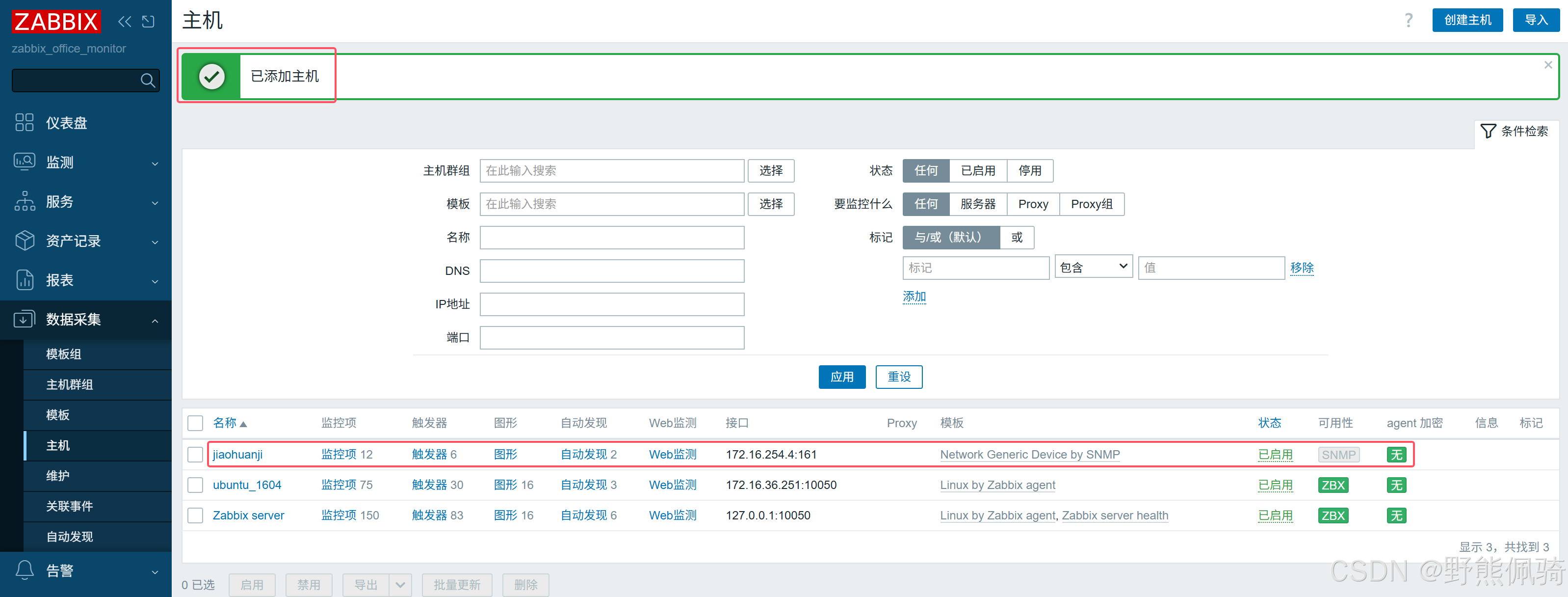 172.16.254.3: 指定被监控设备主机的IP地址。由上图可见,IP地址为172.16.254.3的设备主机可以正常返回监控数据给Zabbix服务端主机。