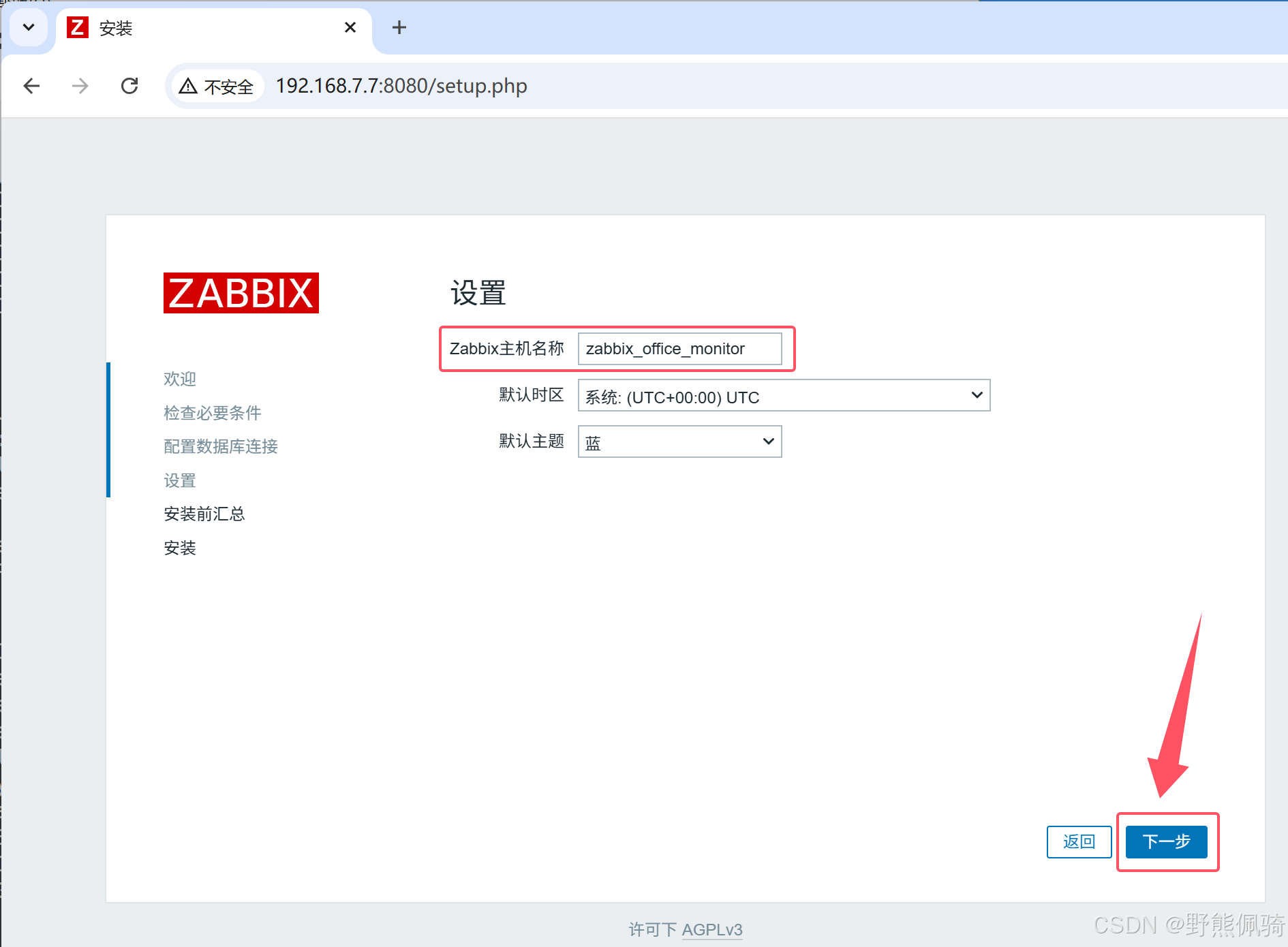 - 配置Zabbix主机名称,此处配置为"zabbix_office_monitor",点击"下一步"