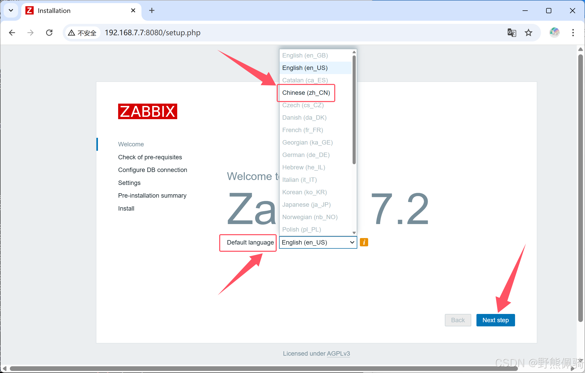 - Default language选择Chinese(zh_CN),点击"下一步"