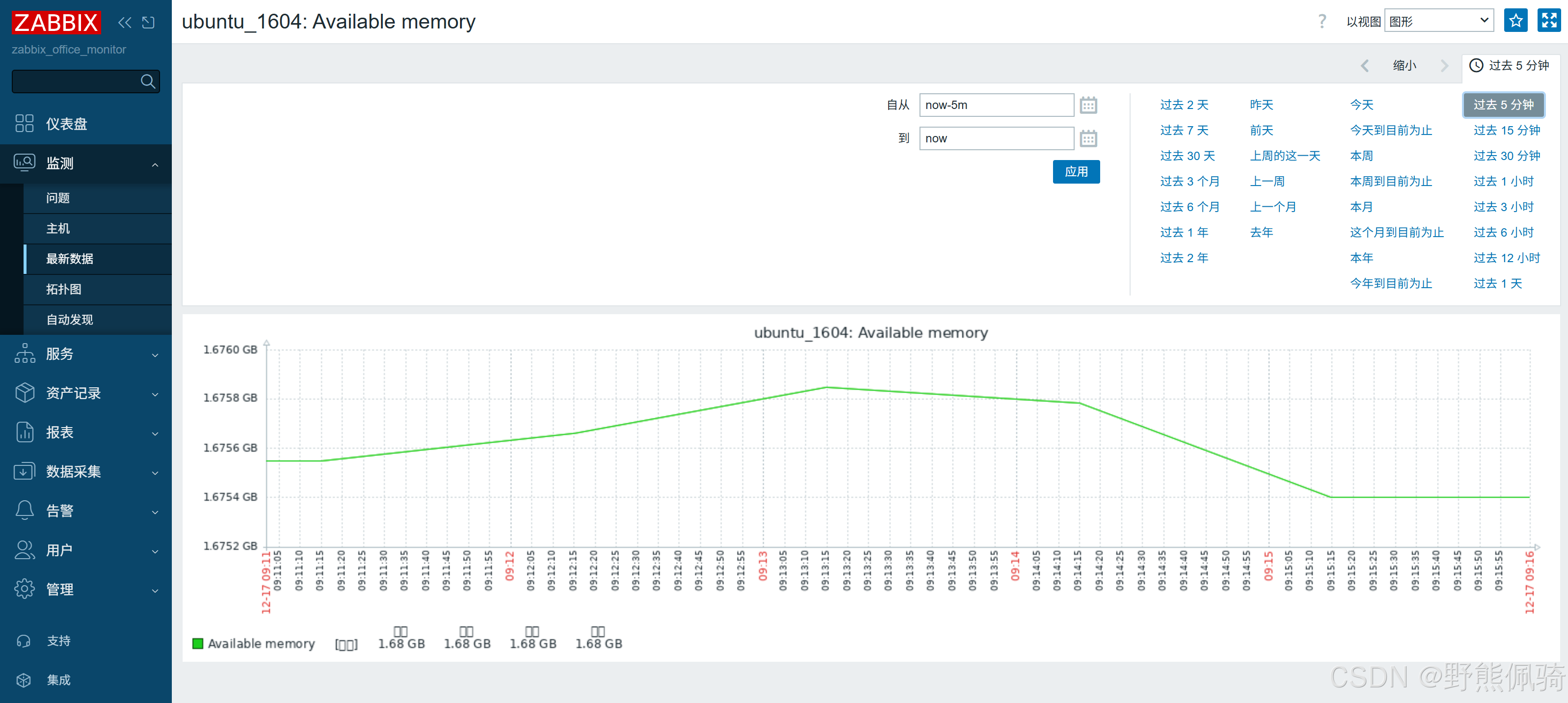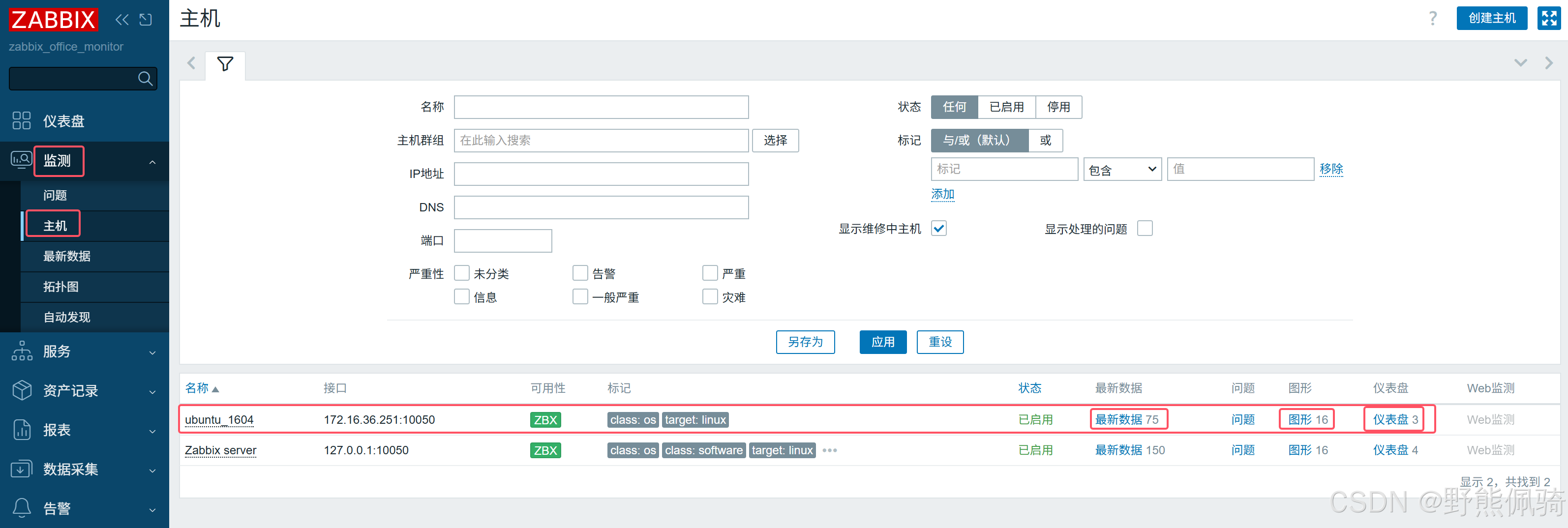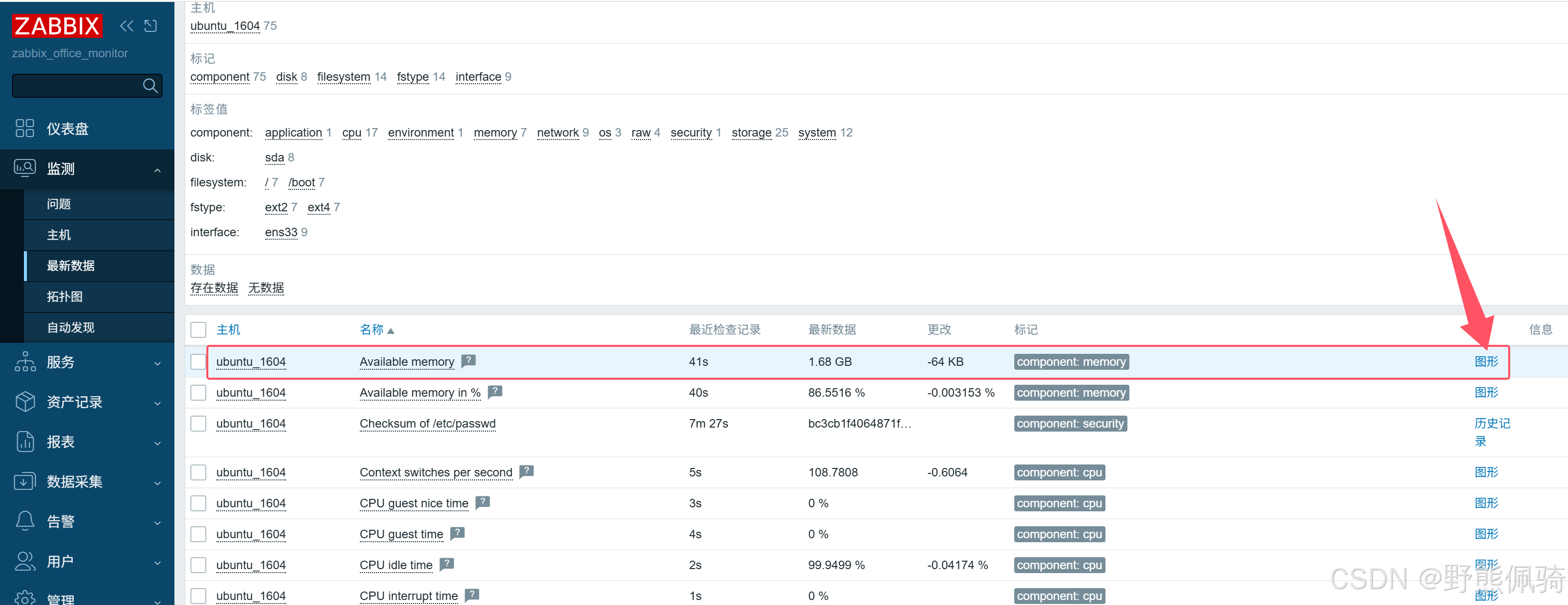 选择"监测"-->"主机",点击"最新数据"、"图形"、"仪表盘"等,都可以看到ubuntu_1604主机的最新监控数据。