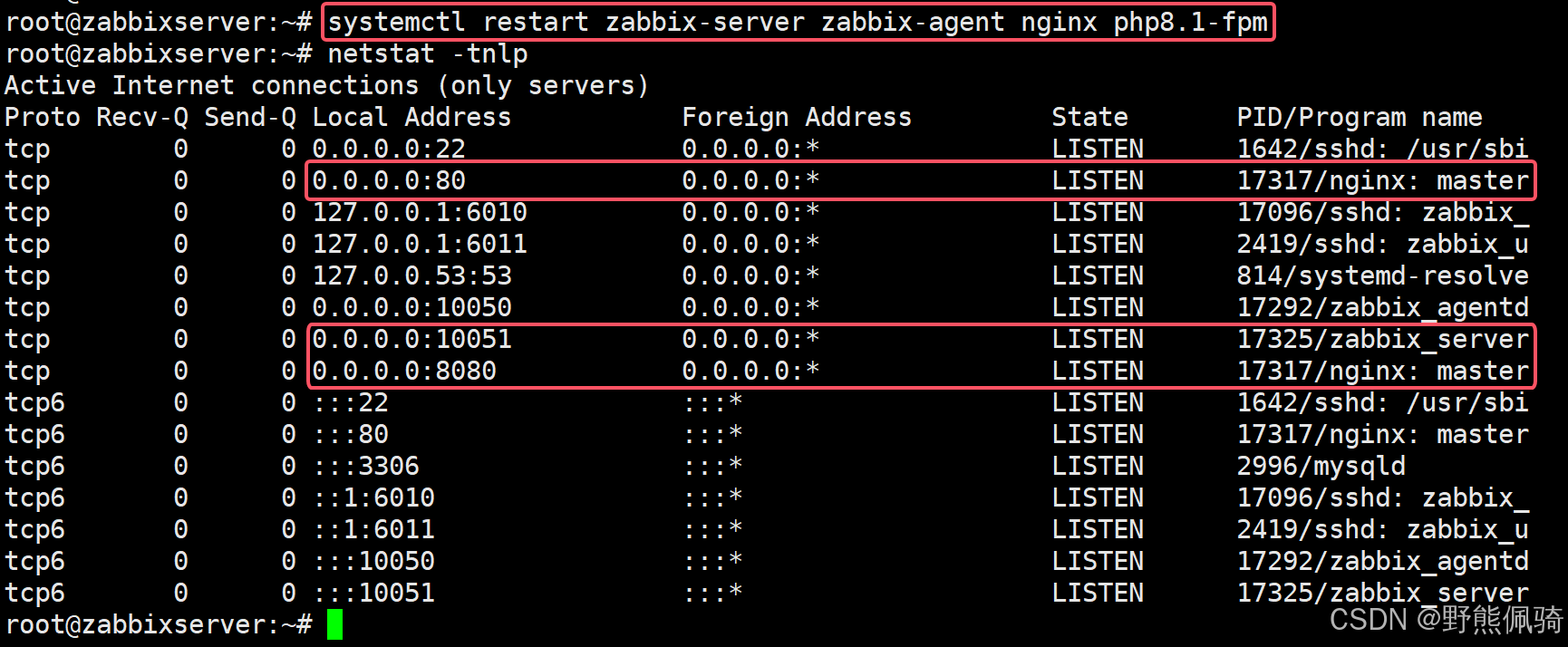 root@zabbixserver:~# systemctl restart zabbix-server zabbix-agent nginx php8.1-fpm root@zabbixserver:~# netstat -tnlp由上图可见,zabbix-server(10051端口)、zabbix-agent(10050端口)、nginx(8080端口)等进程已经启动。