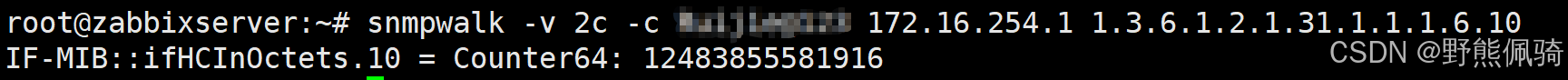 root@zabbixserver:~# snmpwalk -v 2c -c SNMP团体字 172.16.254.1 1.3.6.1.2.1.31.1.1.1.6.10 -v: 指定设备使用的SNMP版本,此处是2c版本; -c: 指定设备使用的SNMP团体字; 172.16.254.1: 指定被监控设备主机的IP地址; 1.3.6.1.2.1.31.1.1.1.6.10:指定的OID。