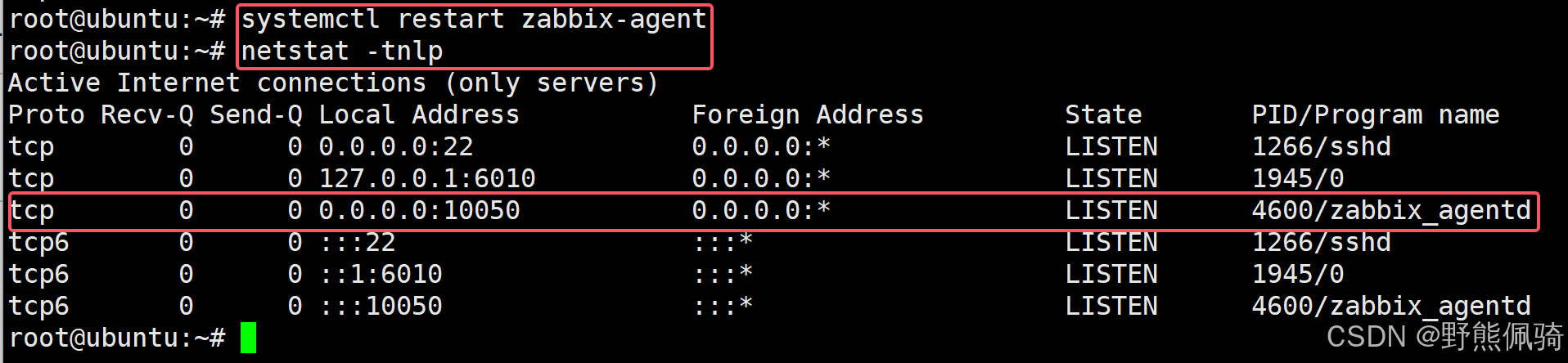 root@ubuntu:~# systemctl restart zabbix-agent root@ubuntu:~# netstat -tnlp由上图可见,10050端口启动说明Zabbix代理已经正常运行。