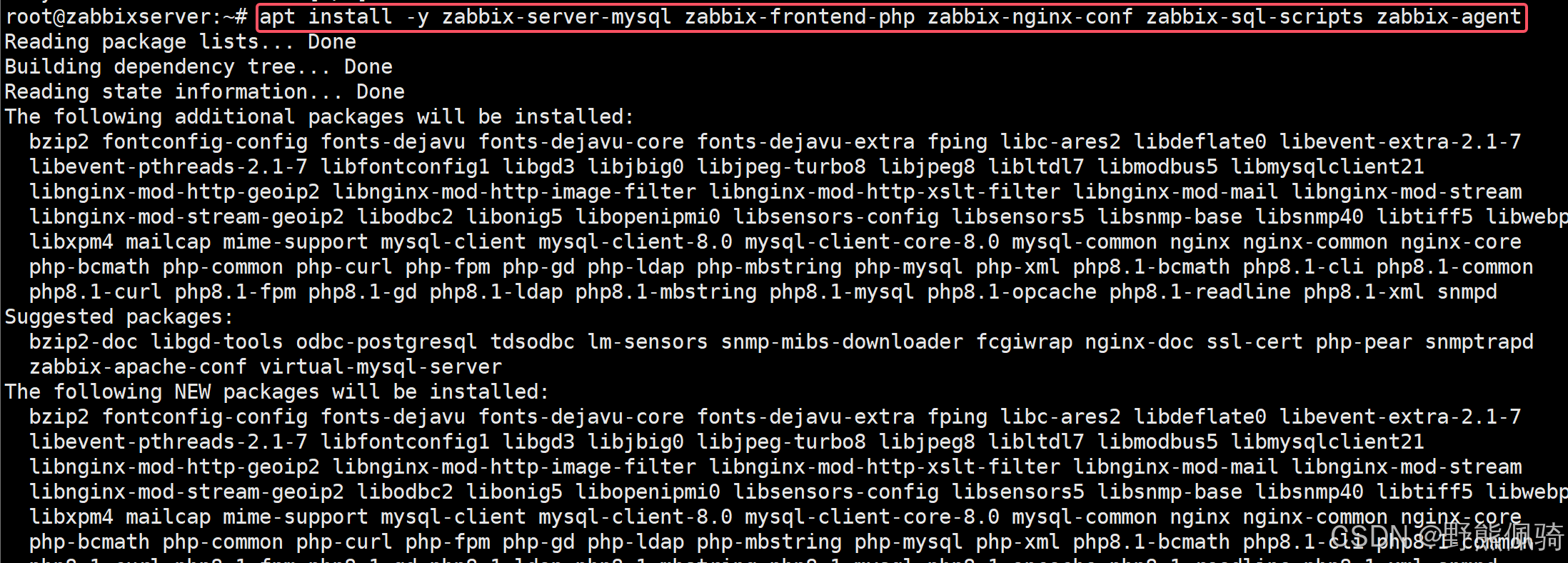 root@zabbixserver:~# apt install -y zabbix-server-mysql zabbix-frontend-php zabbix-nginx-conf zabbix-sql-scripts zabbix-agent