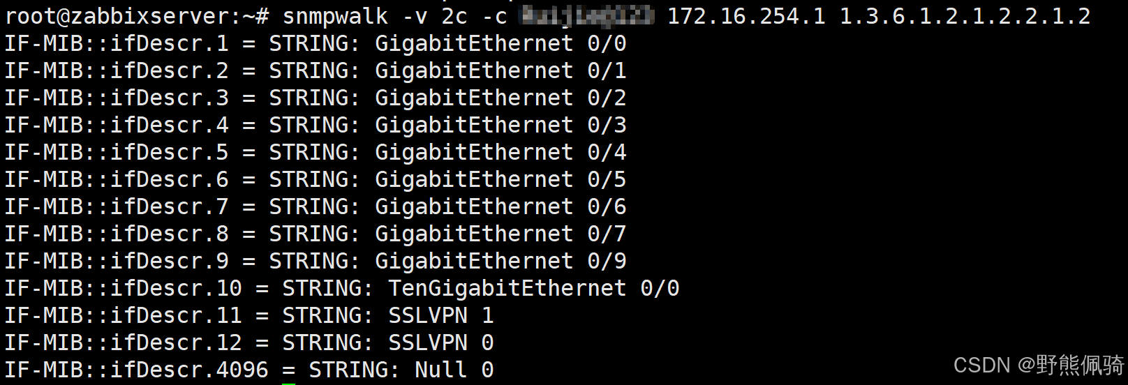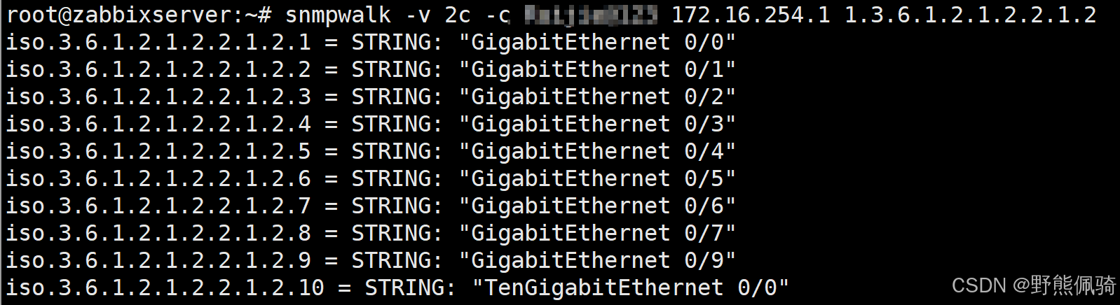 root@zabbixserver:~# snmpget -v 2c -c SNMP团体字 -On 172.16.254.1 IF-MIB::ifDescr.10 -v: 指定设备使用的SNMP版本,此处是2c版本; -c: 指定设备使用的SNMP团体字; -On:指定被监控设备主机的IP地址,此处是172.16.254.1; IF-MIB::ifDescr.10: 指需要转换为OID的MIB名称,此处是端口名称。