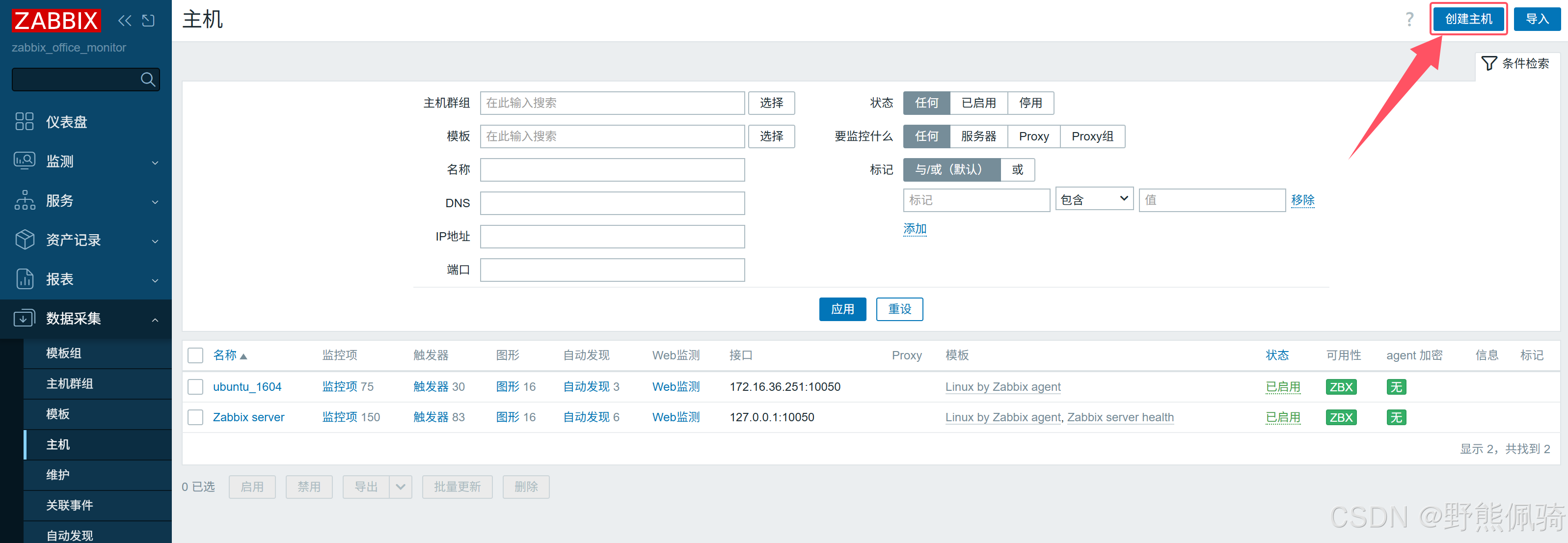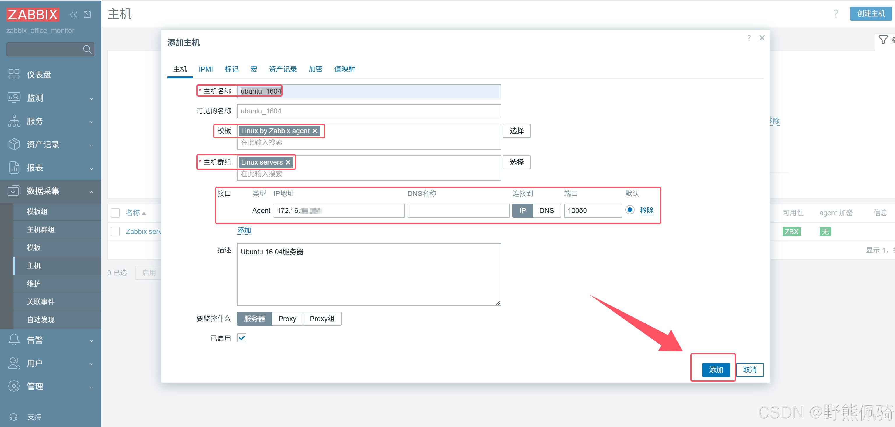 **主机群组:**Linux servers(可以自己新建一个主机群组,此处选择默认的主机群组)