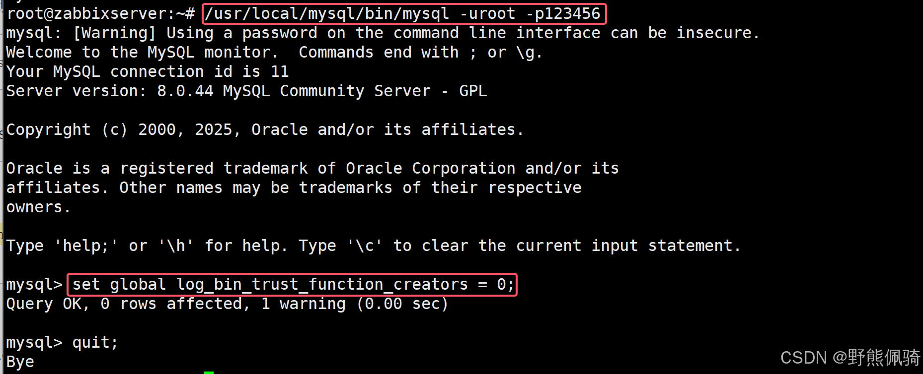 root@zabbixserver:~# /usr/local/mysql/bin/mysql -uroot -p123456 mysql> set global log_bin_trust_function_creators = 0; mysql> quit;