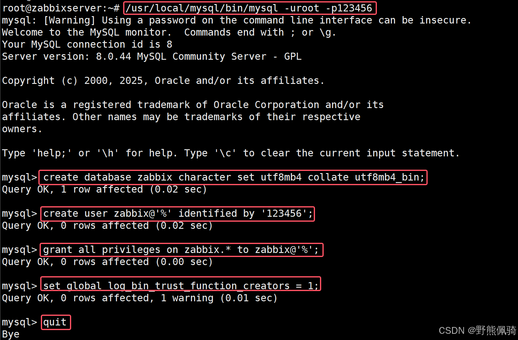 root@zabbixserver:~# /usr/local/mysql/bin/mysql -uroot -p123456 mysql> create database zabbix character set utf8mb4 collate utf8mb4_bin; mysql> create user zabbix@'%' identified by '123456'; mysql> grant all privileges on zabbix.* to zabbix@'%'; mysql> set global log_bin_trust_function_creators = 1; mysql> quit