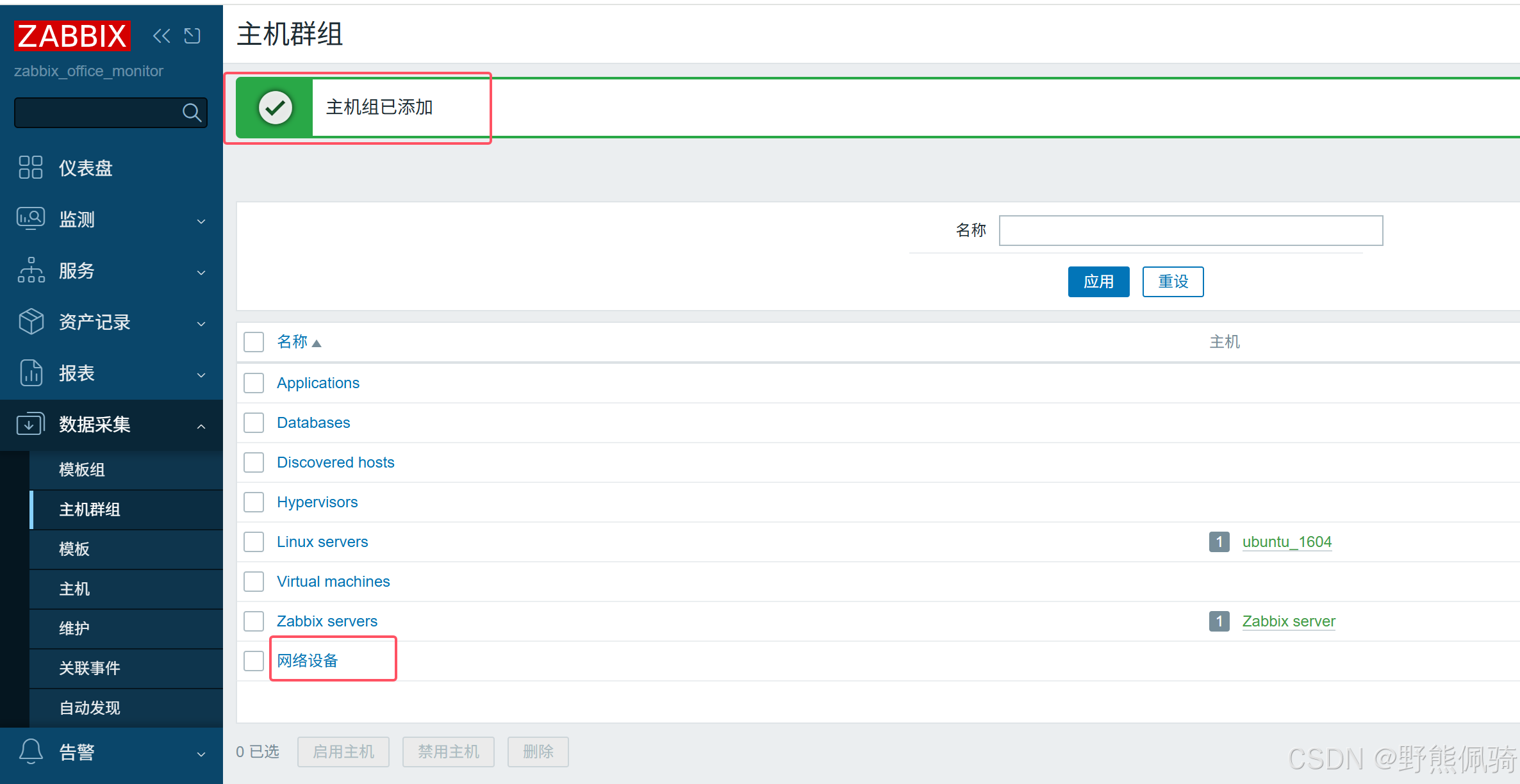 由上图可见,已经成功添加名为"网络设备"的主机群组。