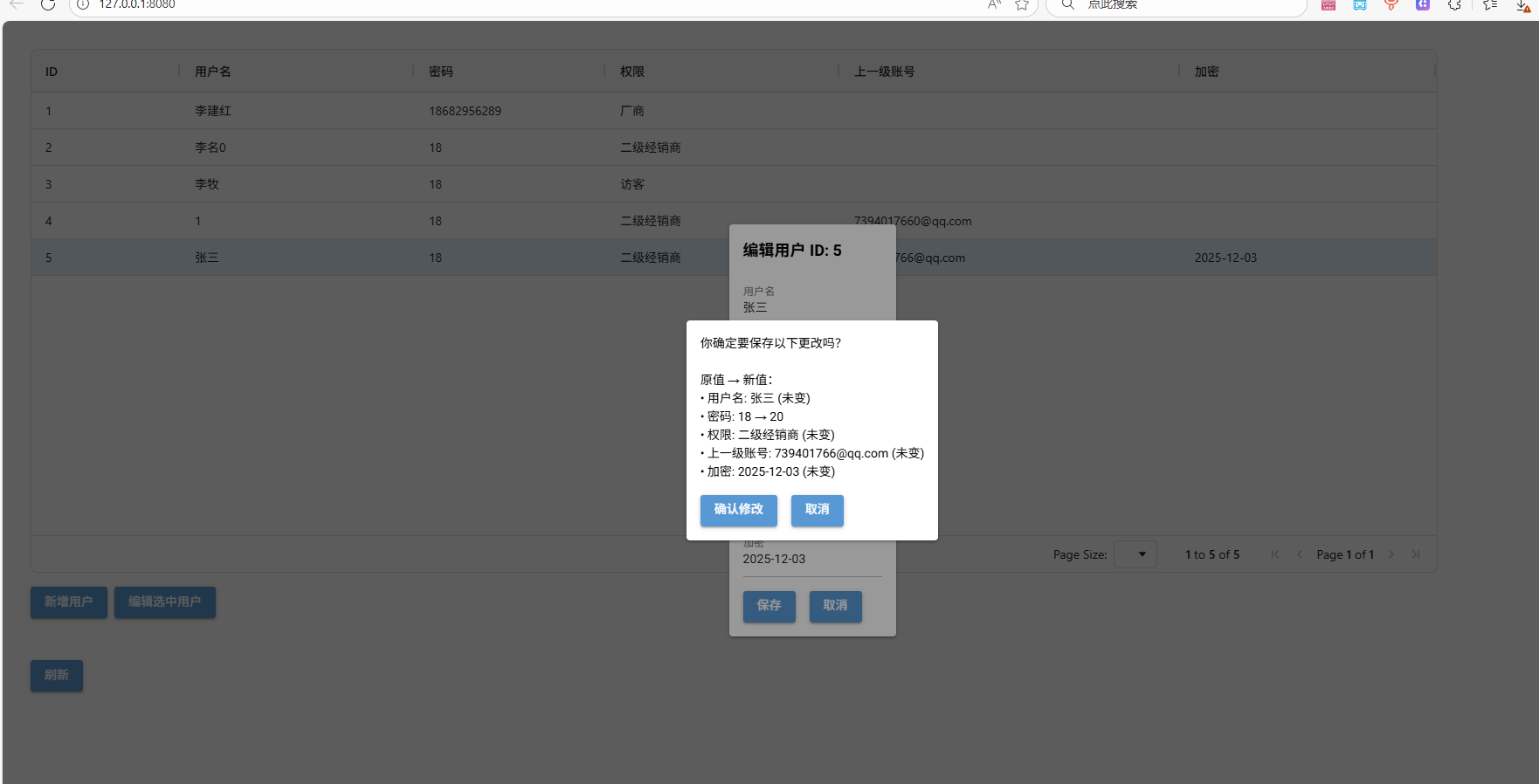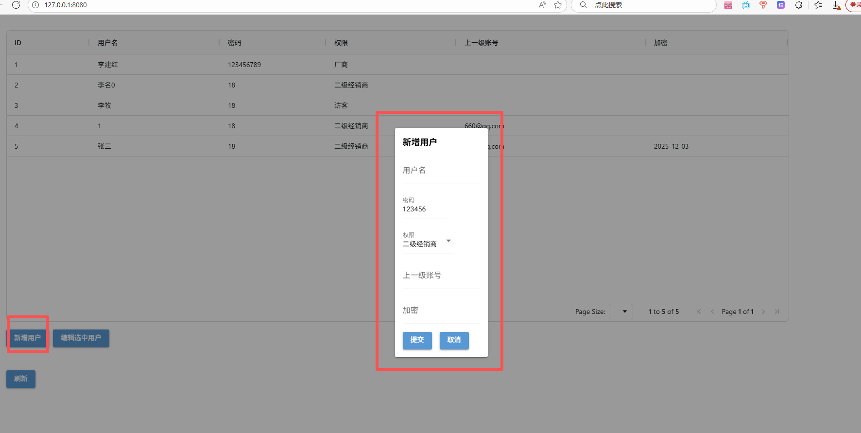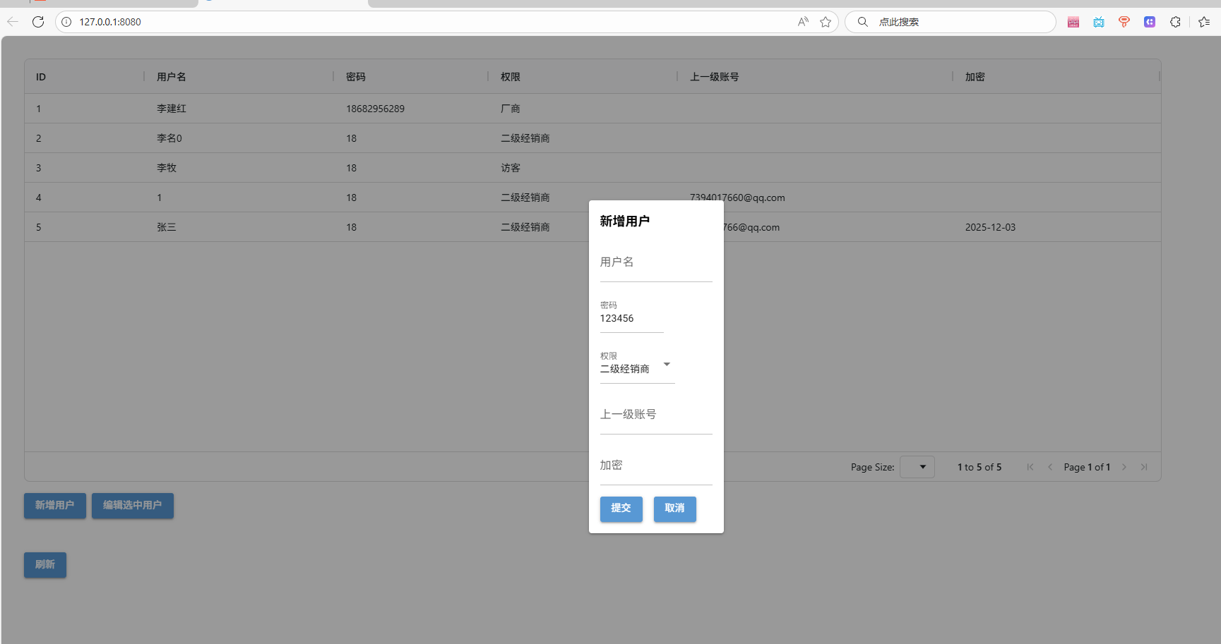 [('李建红', 123456, '一级经销商', 'lijianhong@example.com', '18682956289')]