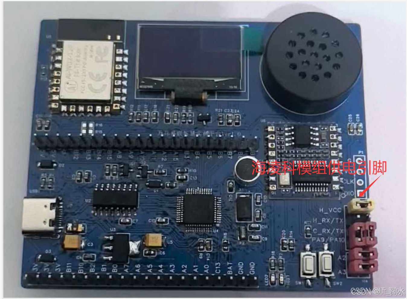 如下图为海凌科模组供电引脚,点击烧录前先拔掉该跳线帽,出现等待设备后再插上该跳线帽。