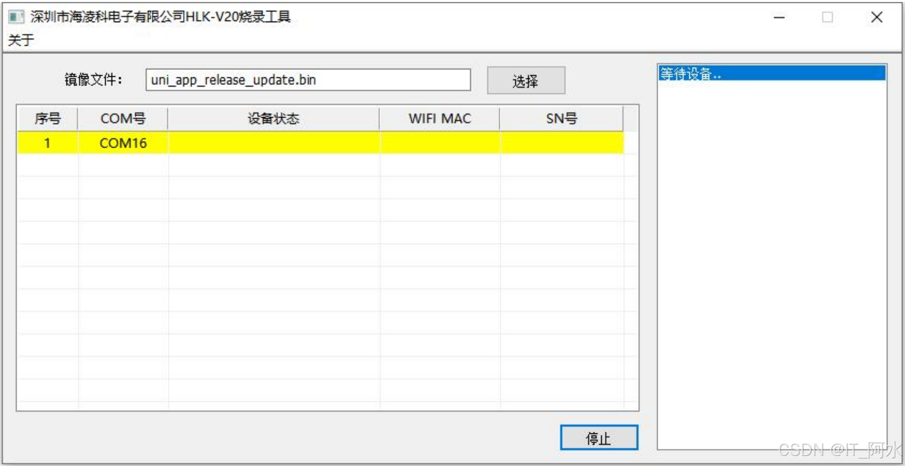 点击烧录按钮, 如图所示,提示栏显示等待设备。(注意:此时设备不要上电)。