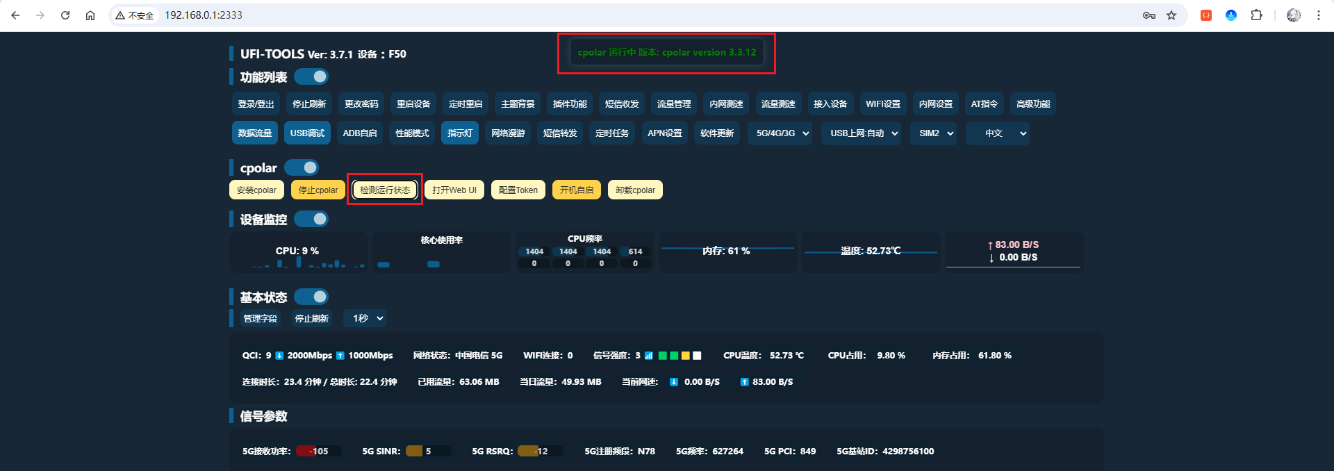 http://192.168.0.1:2333/验证页面可用。 - 部署 cpolar 插件并启动 :在 UFI-TOOLS 启用高级功能,导入