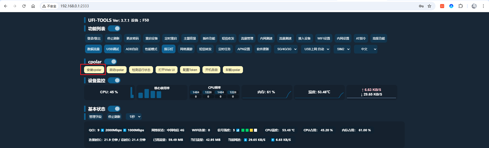 访问成功,且登录后可以正常获取F50设备的数据,至此,已将UFI-TOOLS工具通过固定二级子域名稳定映射到公网,一个永久不变的地址就设置完成啦!由于UFI-TOOLS已穿透至公网访问,建议将登录的密码修改为更强的口令,提升安全性!