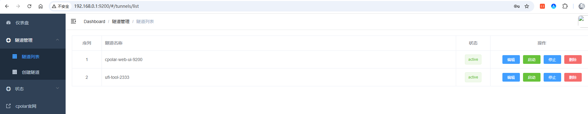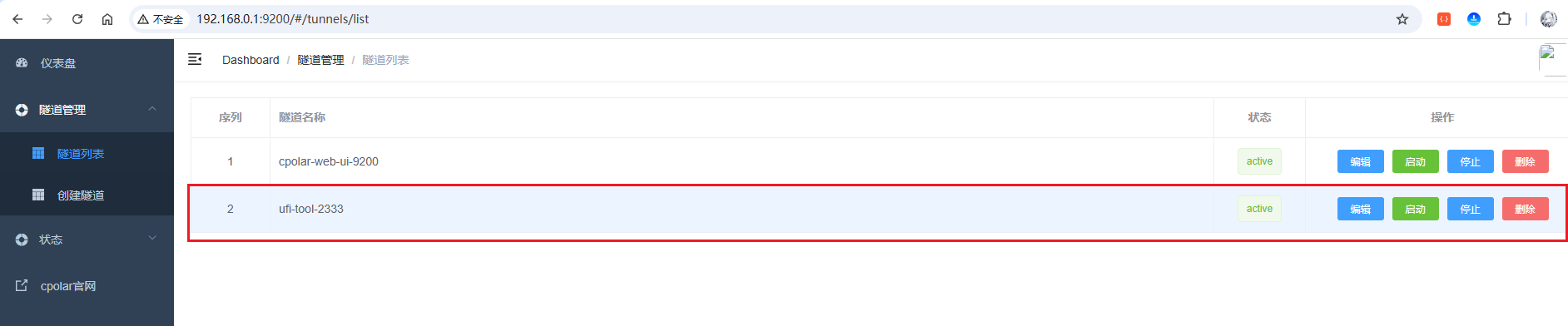 接下来,进入侧边菜单栏的隧道管理下的隧道列表,可以看到名为ufi-tool-2333的隧道: