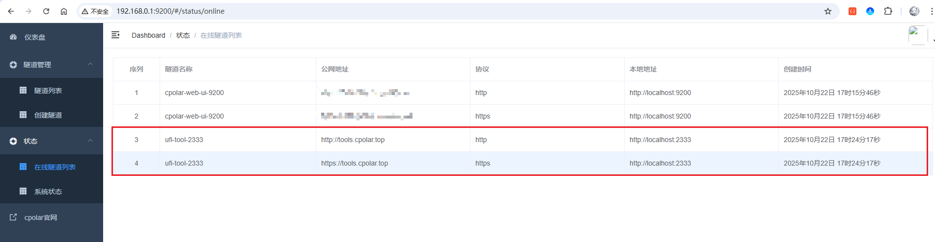 来到状态菜单下的在线隧道列表可以看到隧道名称为ufi-tool-2333的公网地址已经变更为二级子域名+固定域名主体及后缀的形式了: