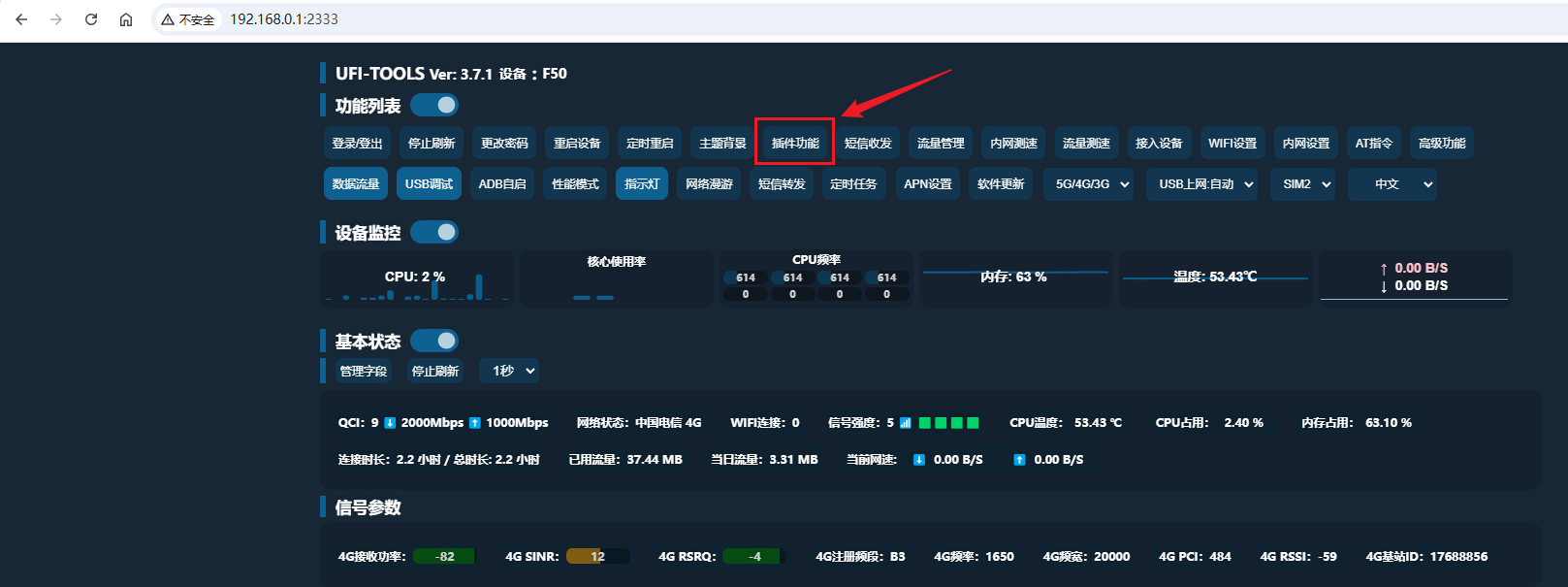首先,UFI-TOOLS管理页中点击高级功能按钮(如果为灰色,请左上角登录/登出按钮进行登录你的随身wifi):