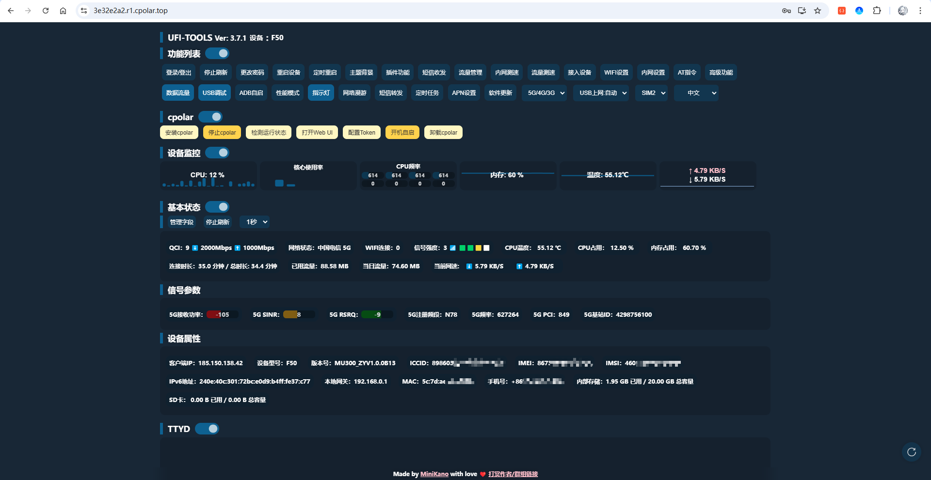 UFI-TOOLS 是网友 MiniKano 开发的开源神器,专为中兴 F50 随身 WiFi 量身打造。它就像给设备装了个 "智能大脑",能监控信号强度、温度、CPU 占用这些 "健康数据",还能手动锁频段、锁小区提升网速,甚至能控制指示灯、切换性能模式,把原本功能单一的随身 WiFi 变成可远程操控的智能终端。