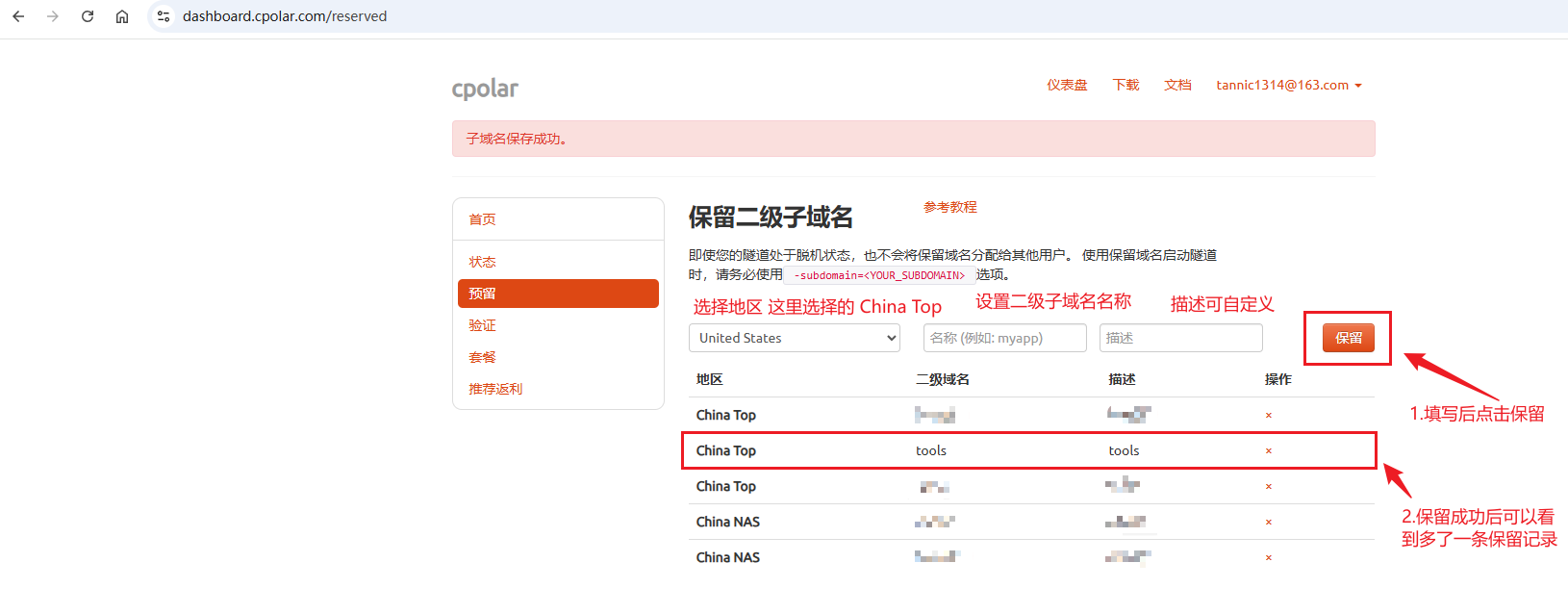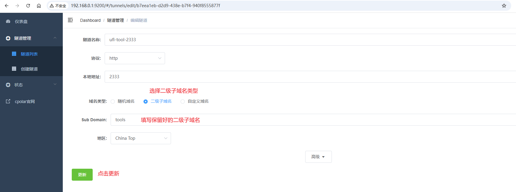 由于前面设置的为随机域名,随机域名的数据隧道处于临时状态(每24小时重置一次),大多用于测试场景。作为像UFI-TOOLS这样的管理页面,更适合长期访问,所以这里进行设置一个固定二级子域名,使其长期不变,方便记忆的域名。